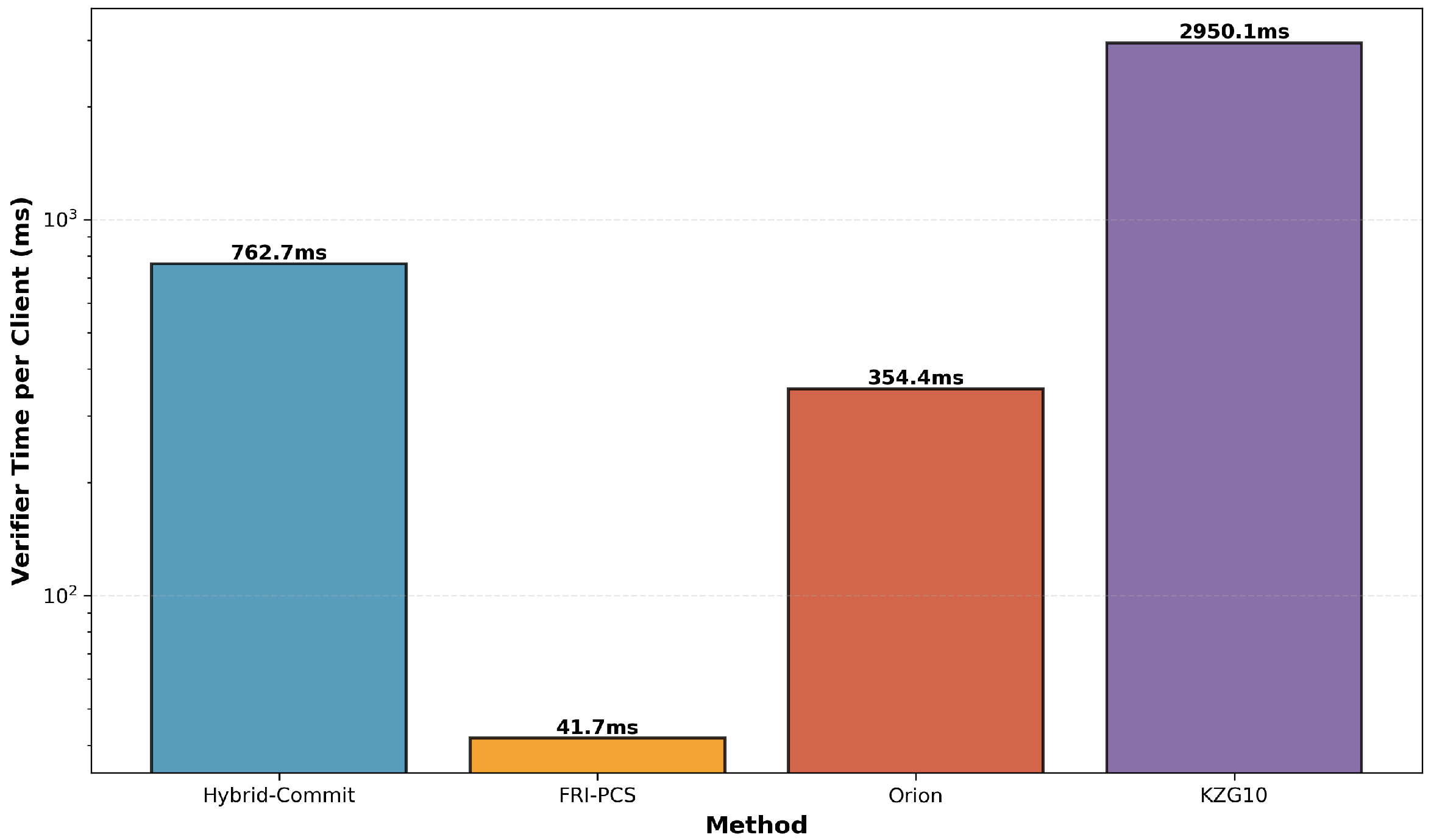 Figure 4 provides a detailed comparison of per-client verification times across all methods. The logarithmic scale highlights the orders-of-magnitude differences between approaches. KZG10 requires 2950 ms per client due to pairing operations, while Hybrid-Commit requires 762 ms per client (combining both additive KZG10 pairing-based and multiplicative hash-based verification). FRI-PCS achieves 464.94 ms per client, and Orion achieves 45.35 ms per client. The key insight is that Hybrid-Commit provides a balanced trade-off: it offers comprehensive security guarantees (both additive and multiplicative verification) with moderate computational cost, making it suitable for production federated learning systems where security and performance must be balanced.