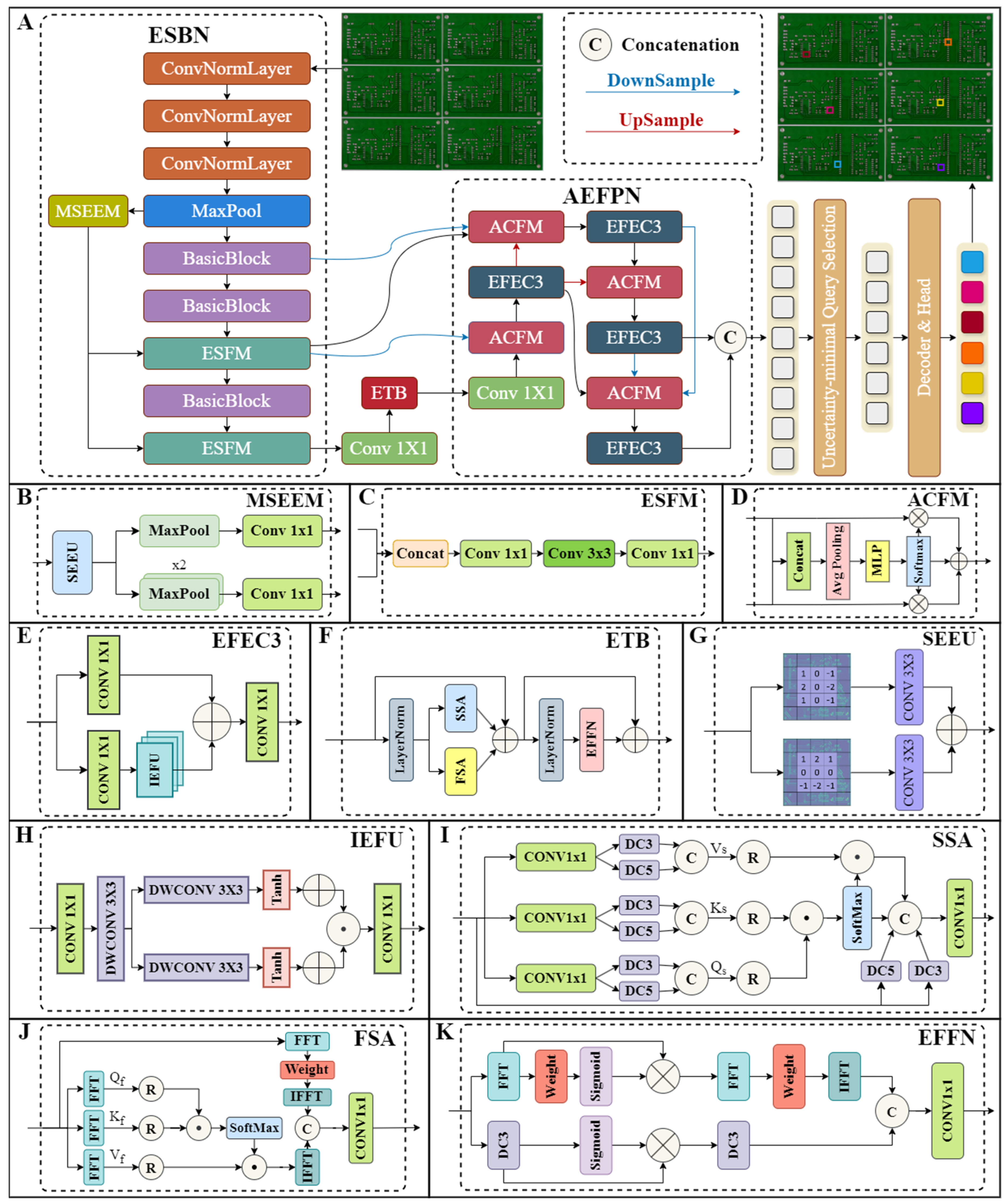 - We propose AEFPN, an Adaptive Enhancement Feature Pyramid Network. Using cross-scale weighted fusion and local texture enhancement strategies, AEFPN alleviates the attenuation of shallow-layer details and enables more stable small-object feature propagation, thereby enhancing the model’s ability to detect minute defects in complex PCB layouts.