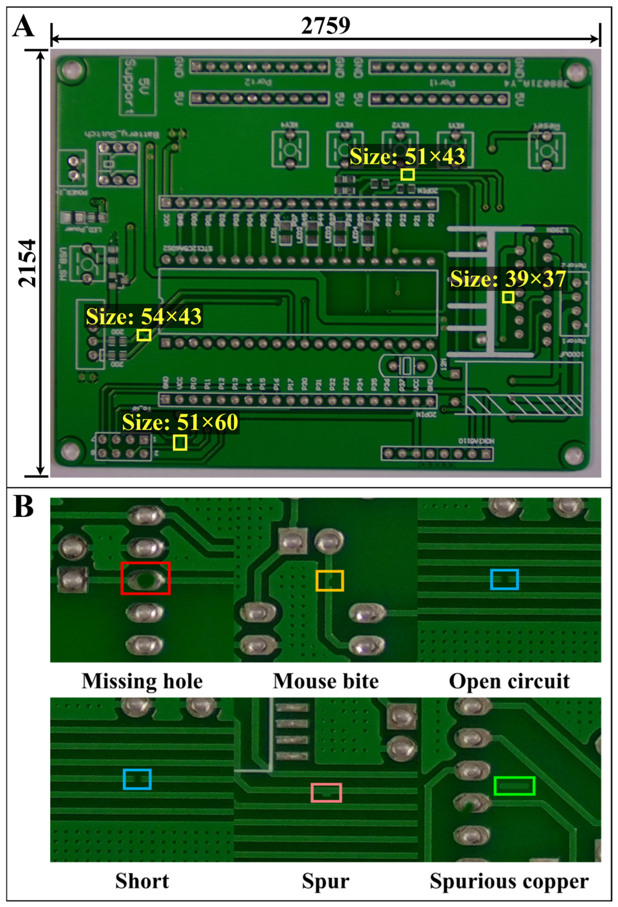 - Zhou, Y.B.; Yuan, M.H.; Zhang, J.; Ding, G.F.; Qin, S.F. Review of vision-based defect detection research and its perspectives for printed circuit board. J. Manuf. Syst. 2023, 70, 557–578. [Google Scholar] [CrossRef]