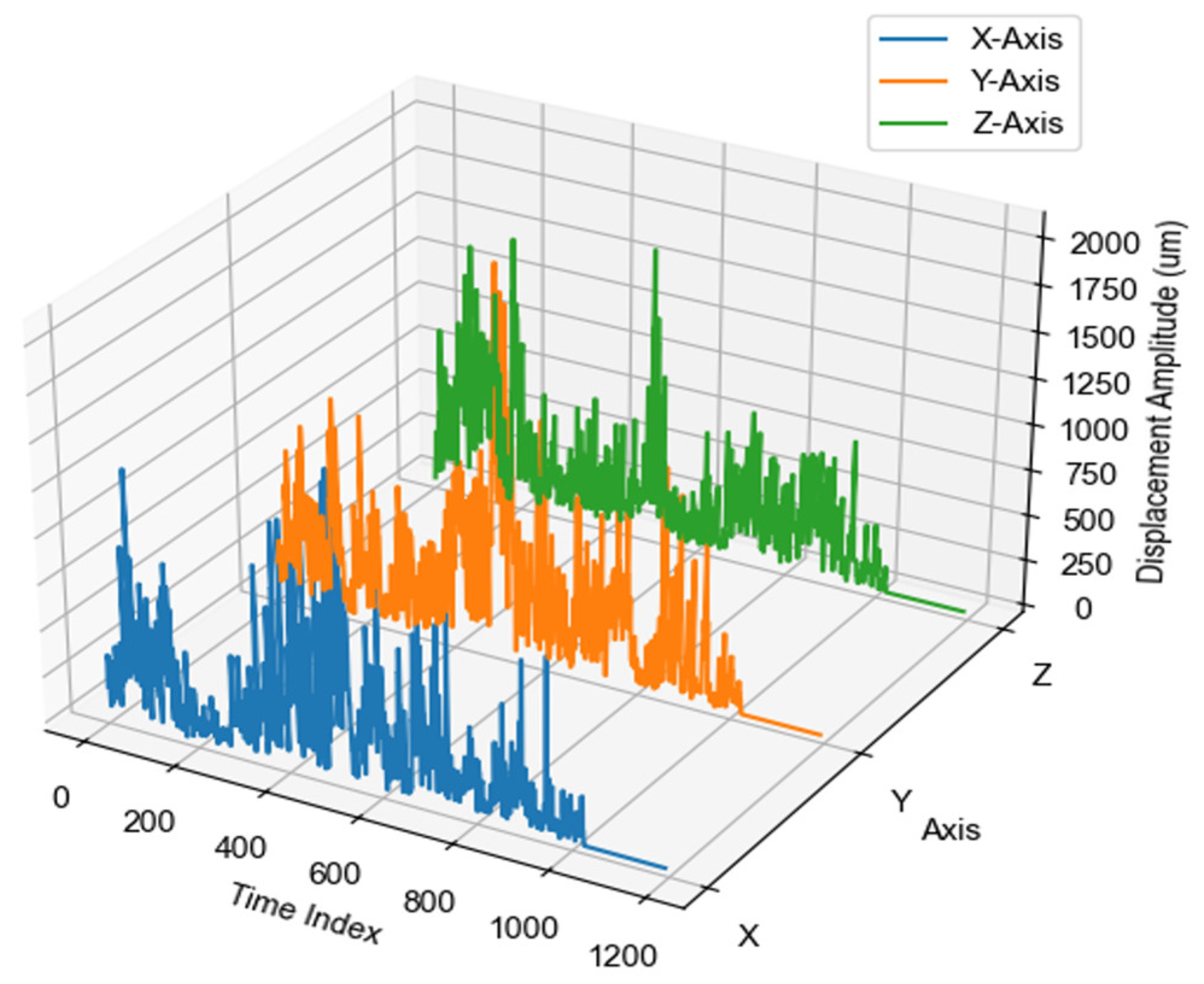 The vibration sensor continuously monitors the operating equipment at a fixed sampling frequency and outputs the results in a standardized data format. The recorded parameters include three-axis vibration velocity and three-axis vibration displacement, which are illustrated in
