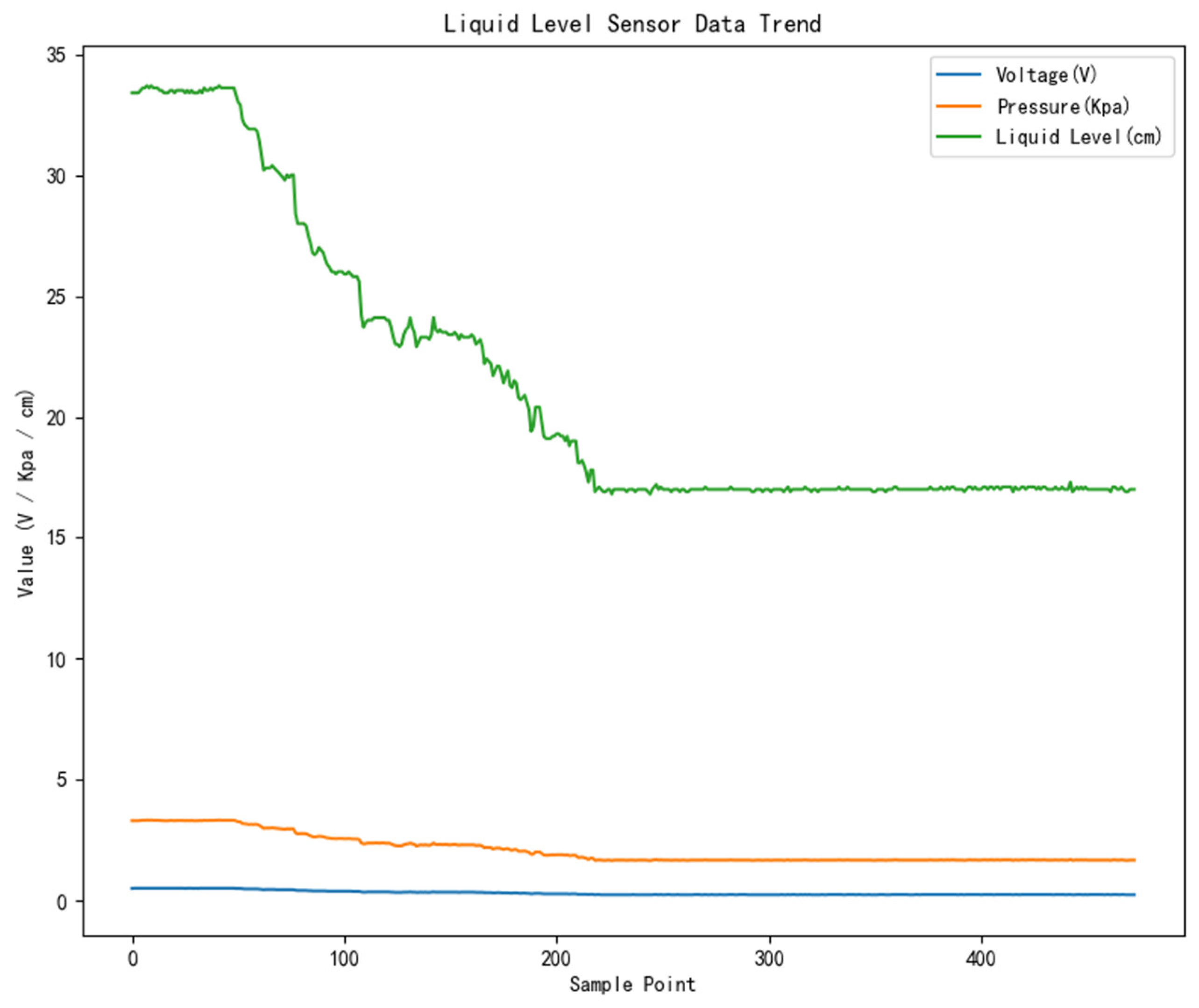 The sensor outputs data in a structured “timestamp–voltage (U)–pressure (P)–liquid-level height (H)” format. All data are stored in CSV files, where each record includes one timestamp field and three core parameter fields. A portion of the recorded data is presented in