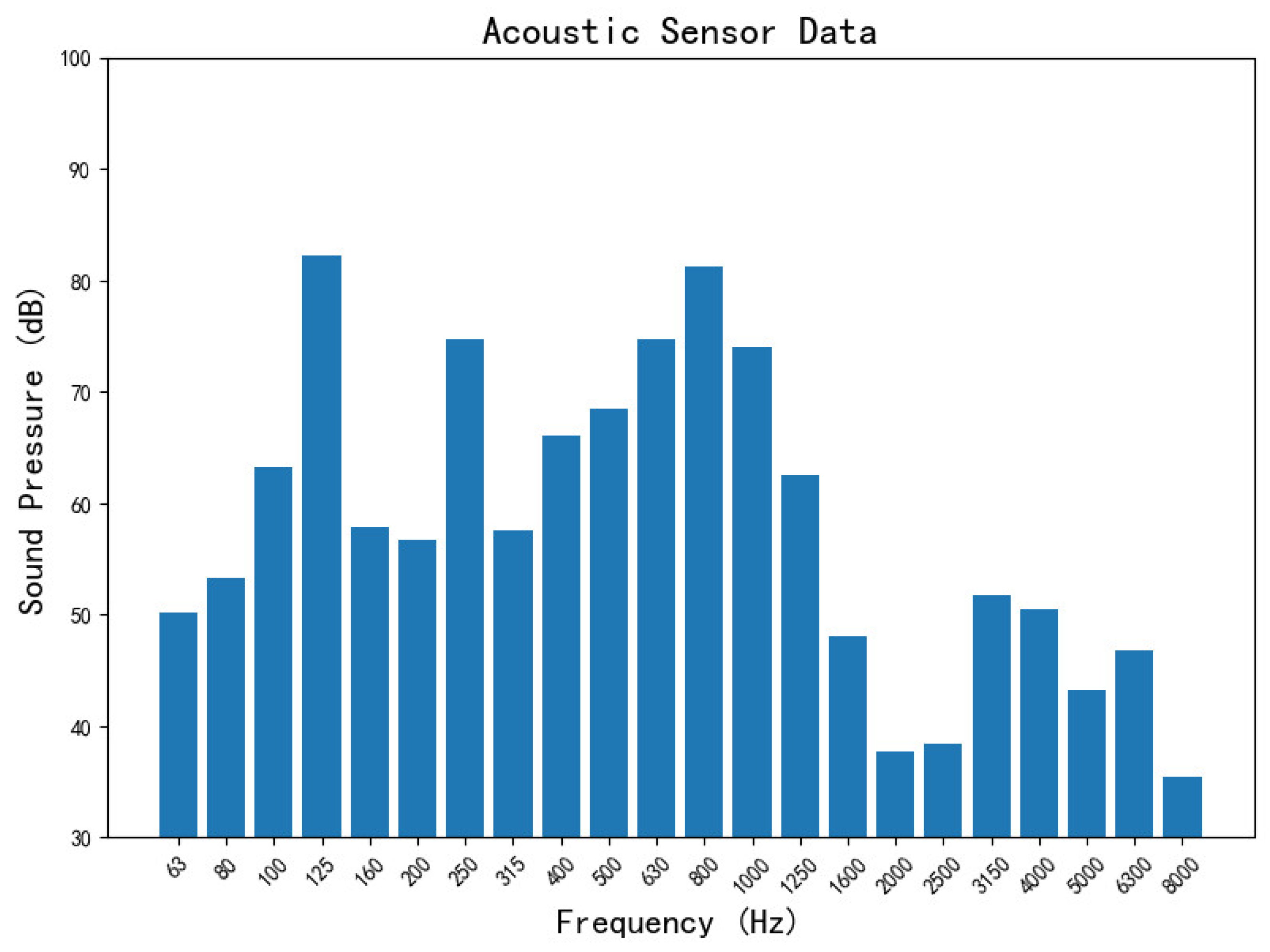 To enable early detection of hidden faults, the proposed system employs an industrial-grade acoustic sensor with strong electromagnetic interference resistance. The sensor operates at a sampling frequency of 1 Hz, capturing sound signals within the 63 Hz–8 kHz frequency range. It outputs structured data containing 22 groups of one third octave band sound-pressure values along with corresponding timestamps. These acoustic measurements provide critical diagnostic information for identifying mechanical faults (e.g., pump and fan anomalies) and fluid faults (e.g., pipeline leakage) at an early stage. By incorporating this acoustic dimension, the system effectively compensates for the limitations of temperature- or vision-based monitoring, thereby establishing a dedicated “acoustic safety monitoring” framework for the SVG water-cooling system.