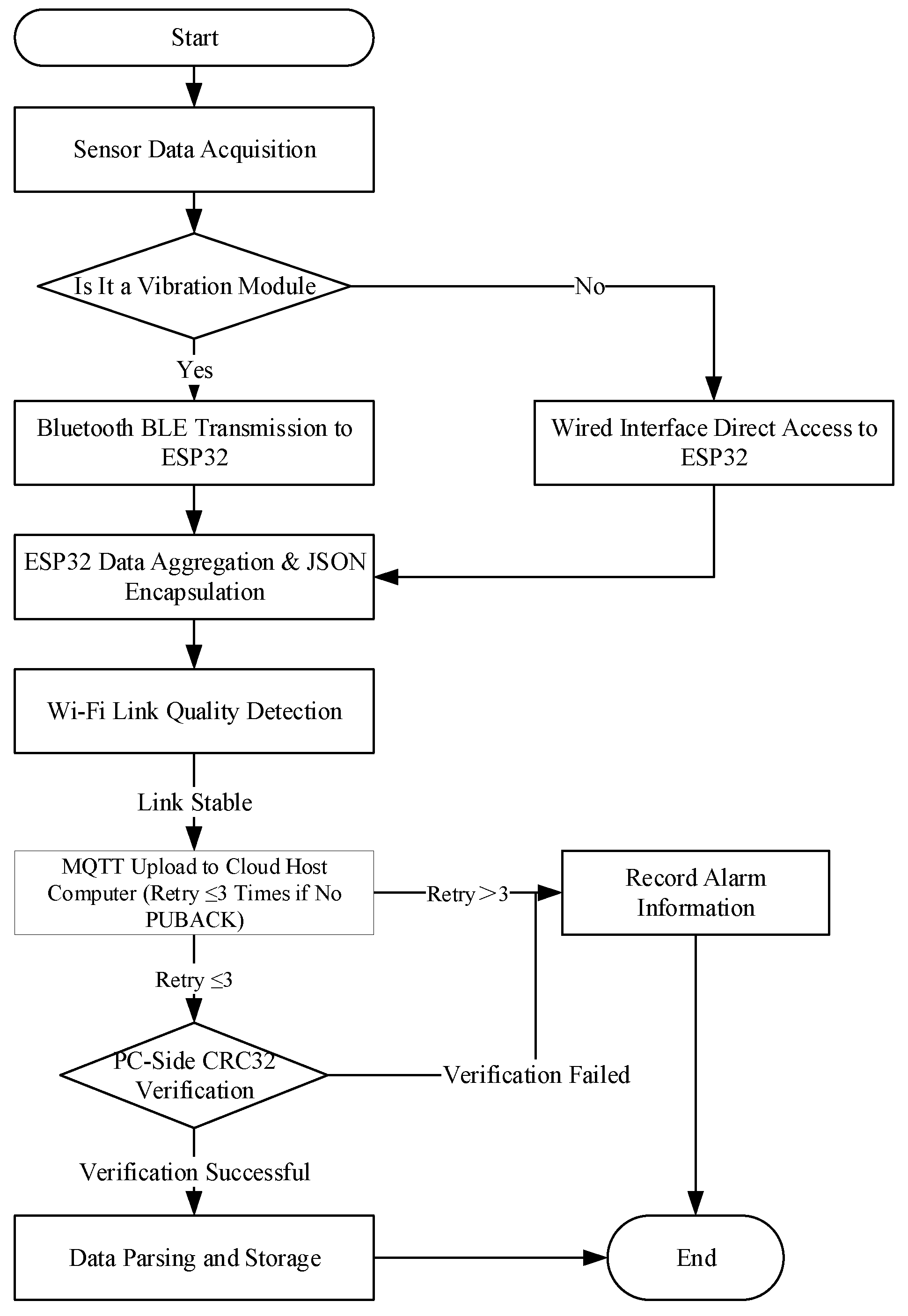 Figure 2. The ESP32 module serves as the core controller of the system, featuring high processing capability and multiple communication interfaces. It integrates both Wi-Fi and Bluetooth functions, enabling dual-mode wireless data transmission that provides a reliable and flexible means of communication. Through these wireless links, the collected data are rapidly transmitted to a local edge-computing node, where large-scale data storage and in-depth analysis can be performed.