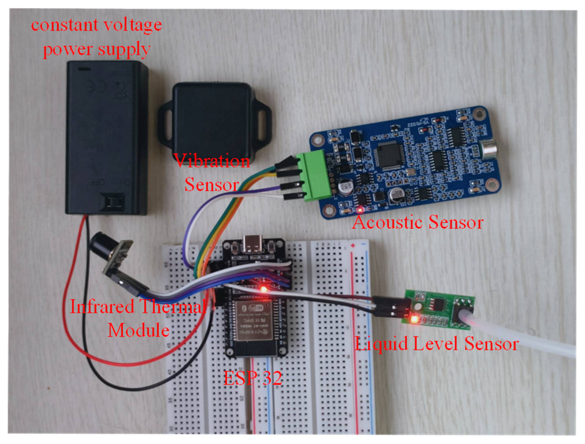 The proposed system is primarily composed of an ESP32 module (Espressif Systems (Shanghai) Co., Ltd., Shanghai, China), an acoustic (sound pattern) sensor (Guangzhou Yingsheng Electronic Technology Co., Ltd., Guangzhou, China), a vibration sensor module (Shenzhen Weite Intelligent Technology Co., Ltd., Shenzhen, China), a liquid-level sensor (Fu’an Stein Electronic Technology Co., Ltd., Fu’an (Ningde City, Fujian Province), China), and an infrared thermal sensor (Shenzhen Yuekeyuanxing Technology Co., Ltd., Shenzhen, China), as shown in