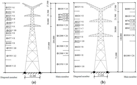 Information on the towers (unit: mm): (a) design plan of G1 and G2 transmission towers; (b) design plan of G3 transmission towers.