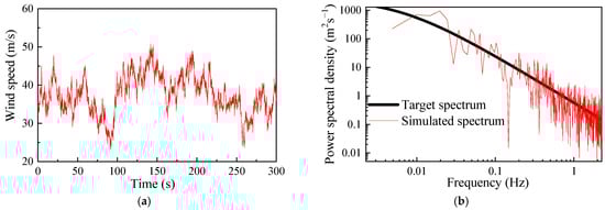 Comparison of the simulated wind-load spectrum with the target spectrum: (a) time history of pulsating wind speed; (b) comparison results.