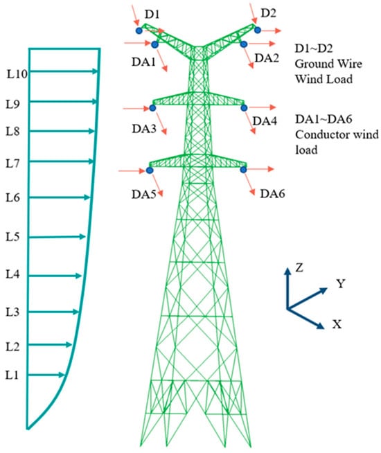 In the equations, Fx and Fy denote the wind load components acting on the transmission tower in the X and Y horizontal directions, respectively; is the air density, taken as 1.225 kg/m3; and θ is the wind attack angle. According to the code [26], a wind attack angle of 0° is defined as the direction perpendicular to the tower-line, while 90° corresponds to the direction along the tower-line. V represents the wind speed at a height of 10 m; A1 and A2 are the projected windward areas of the transmission tower in the transverse and longitudinal directions, respectively; Cxt1 and Cxt2 are the drag coefficients perpendicular to the tower body in the transverse and longitudinal directions, respectively; and G is the wind load combination factor of the structure.