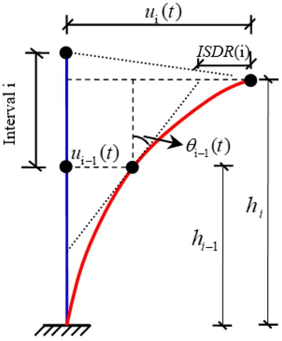 In the equation, i is the index of each segment; ISDR(i) represents the maximum rotational deformation of the ith segment; t is time; ui(t) and ui−1(t) are the horizontal displacement time histories at the top and bottom of the ith segment, respectively; hi and hi−1 are the vertical elevations of the top and bottom of the ith segment, respectively; and θi−1(t) represents the torsional displacement time histories at the top and bottom of the ith segment.