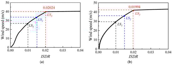 In terms of the pushover analyses, a correlation linking the tower base shear and the maximum ISDR is derived, as shown in Figure 11a–d. The pushover curves follow broadly similar trends across different wind directions, and a distinct inflection point can be identified on each curve. According to the equivalence criterion [30], this inflection point is regarded as the collapse limit state, denoted as LS3. The threshold values for LS1 and LS2 are taken as 50% and 75% of LS3, respectively [31].