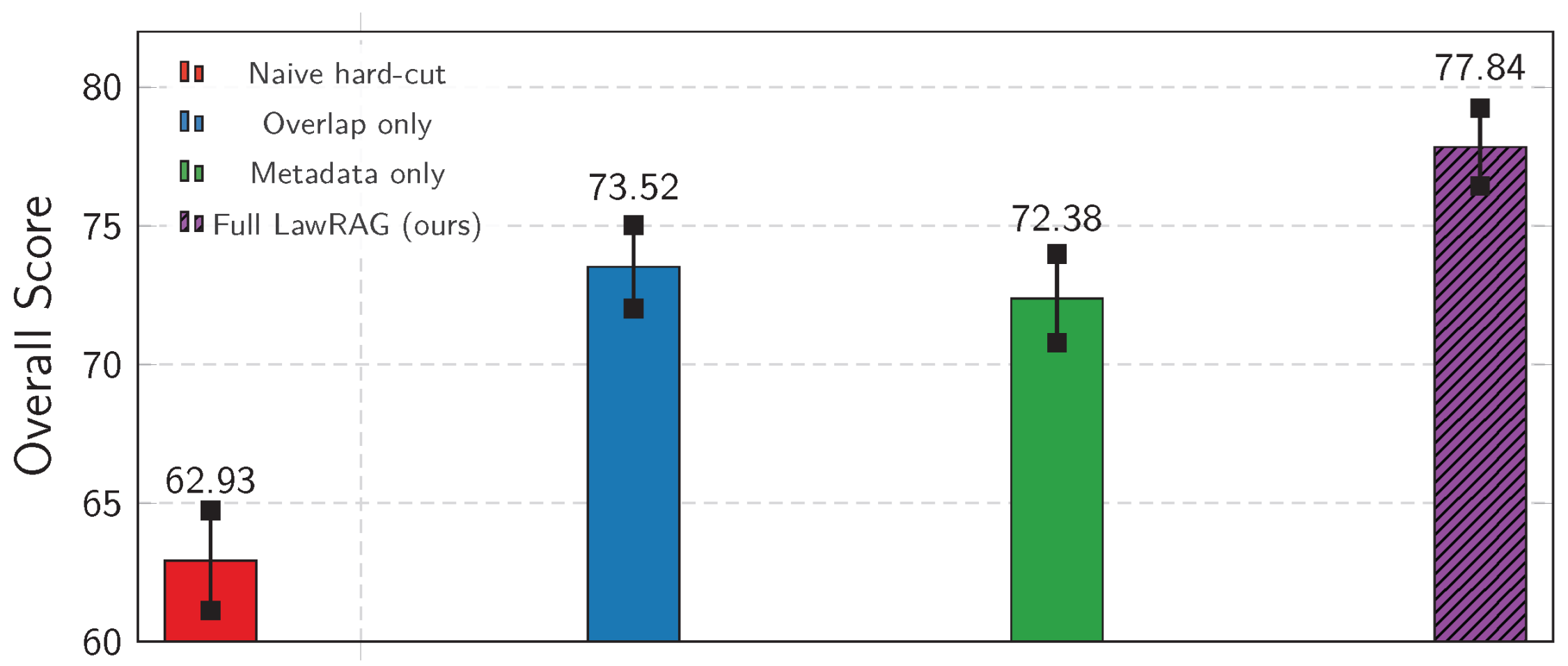 | LawRAG (ours) | 78.4 ± 1.8 | 77.5 ± 1.9 | 78.5 ± 2.1 | 77.1 ± 2.0 | 76.0 ± 2.2 | 79.8 ± 1.6 |