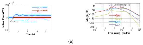 Figure 6a,b, respectively, illustrate the comparison between reactive power disturbances and active power disturbances, as well as the comparison between grid voltage disturbances and active power disturbances. The focus of the study is the system’s active power. It is evident that the impact of reactive power disturbances on active power is smaller than those of grid voltage disturbances and active power disturbances. This observation can be further verified by the magnitude of the bode plot in Figure 6a,b.