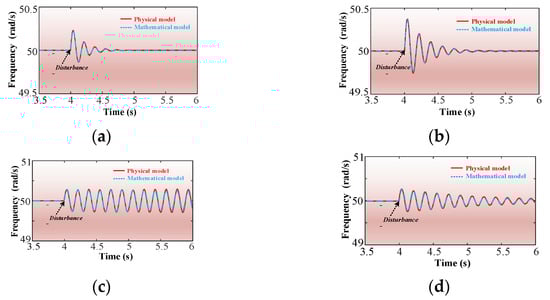 The frequency curves of the mathematical model and the physical model (a–d) under different operating conditions.