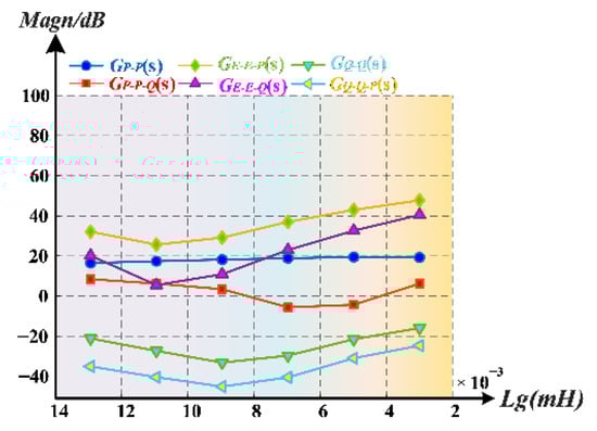 Figure 12 illustrates how the magnitude of the transfer function at oscillation frequency points varies with different disturbances as the grid-side inductance Lg decreases. A larger magnitude implies a stronger disturbance propagation and higher instability, while a smaller magnitude indicates a weaker propagation and enhanced system stability.