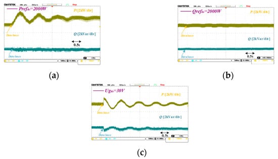 Experimental results: (a) active power reference disturbance; (b) reactive power reference disturbance; (c) grid voltage disturbance.