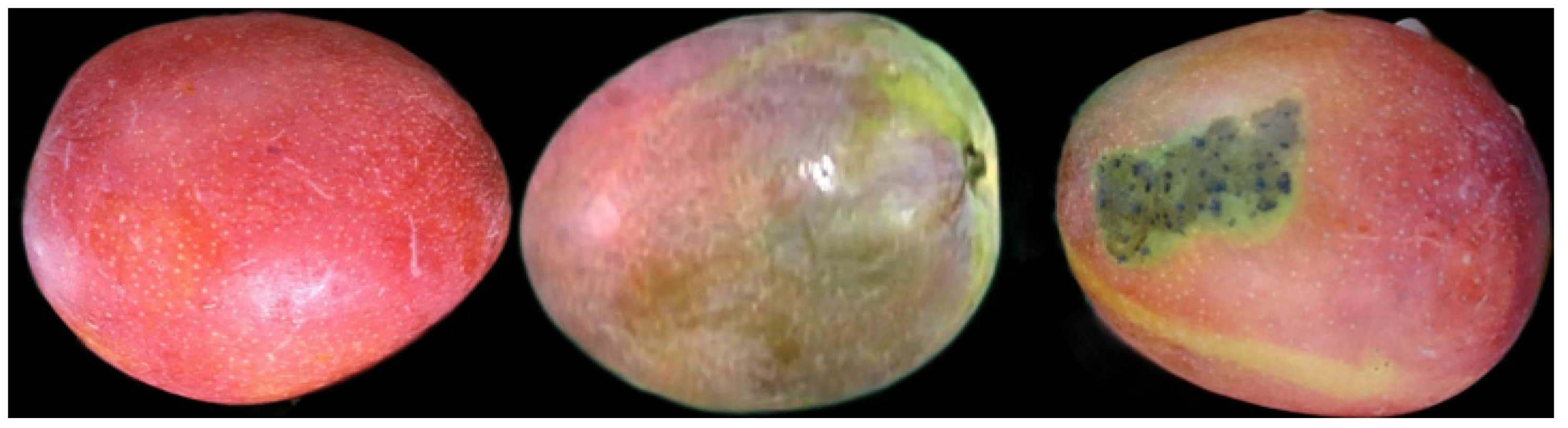 24], where surface defect screening and quality grading are jointly considered. The five-category surface defect classification task is performed as the first screening stage to separate mangoes into pass and fail groups.