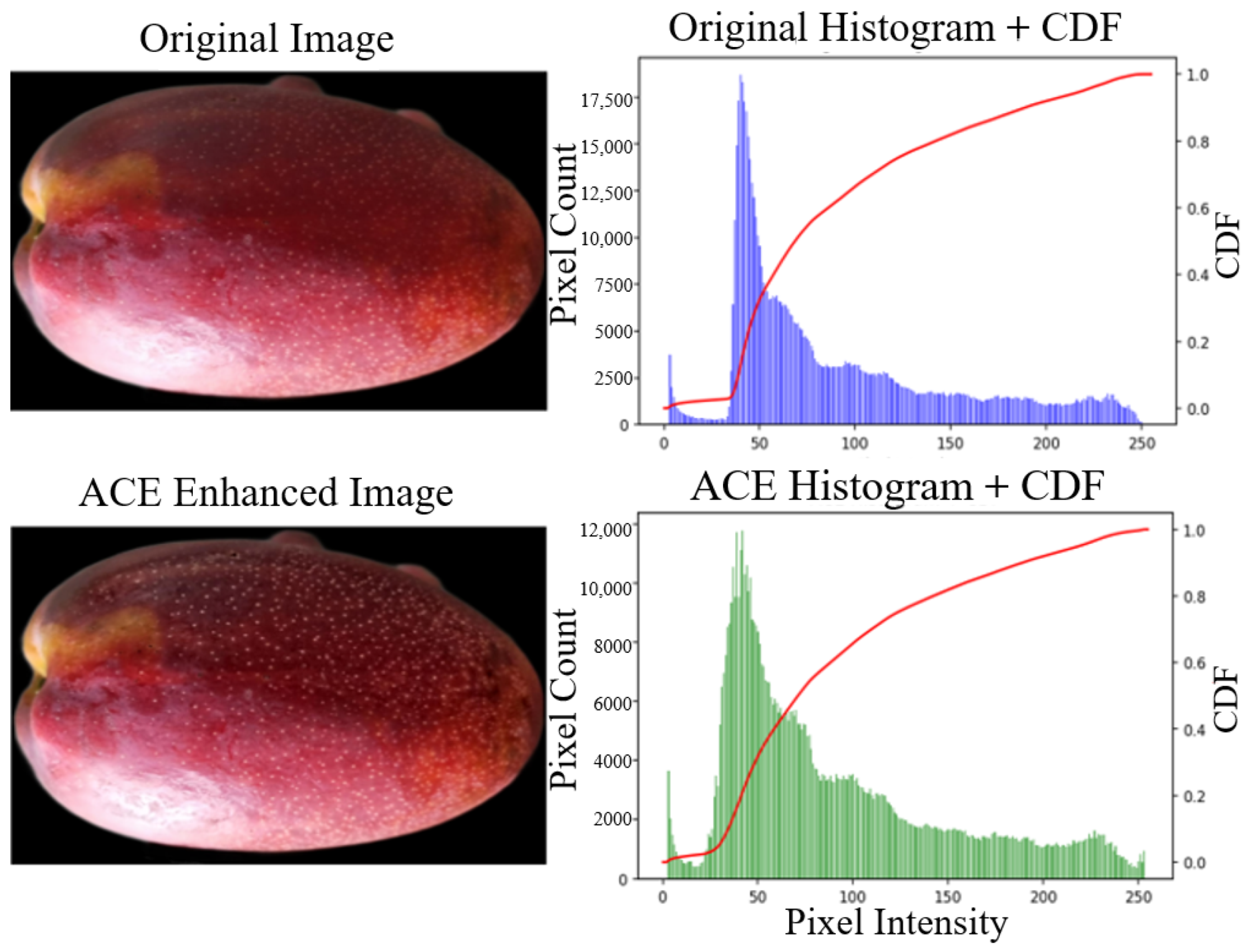 Figure 6, the mango surface texture becomes visually more pronounced after enhancement. The pixel value distribution further confirms this improvement: originally, most pixel intensities were concentrated in the range of 40–60, indicating low contrast. For example, around the intensity level of 50, approximately 17,500 pixels were present before enhancement; this number decreases to about 12,000 after stretching, with values in other intensity ranges correspondingly increasing. This redistribution reflects the expansion of mid-range intensities and indicates an overall improvement in image contrast.