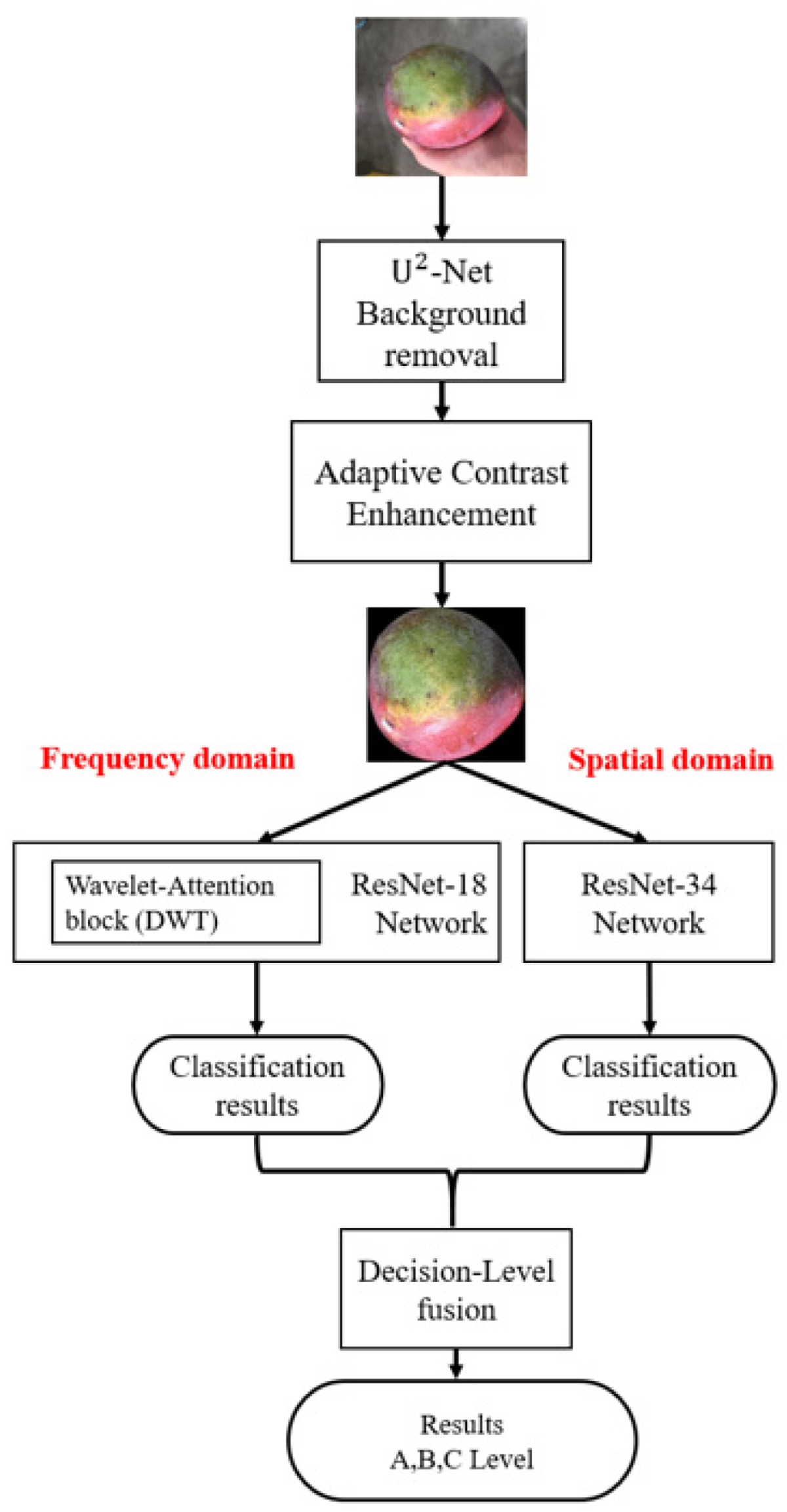 This study proposes a dual-pipeline deep learning framework designed to perform both mango quality grading and surface defect classification. For the quality grading task, we adopt two separate neural network architectures—ResNet-18 for the frequency-domain input and ResNet-34 for the spatial-domain input. Additionally, we apply background removal and Adaptive Contrast Enhancement (ACE) [