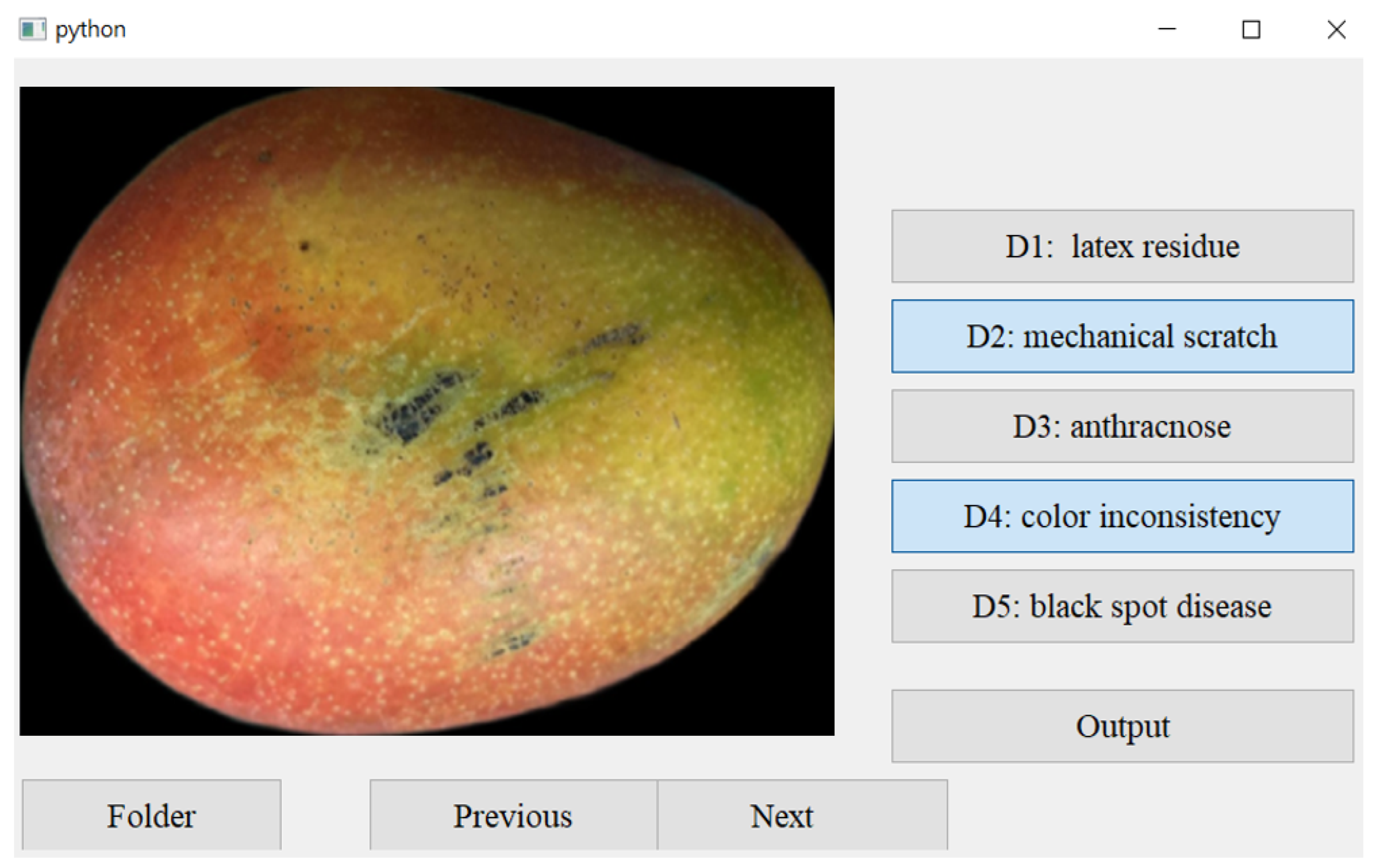 Figure 10. Each mango image is directly assigned a binary label vector indicating the presence or absence of each defect category, enabling rapid and consistent multi-label annotation without the need for region-level labeling.