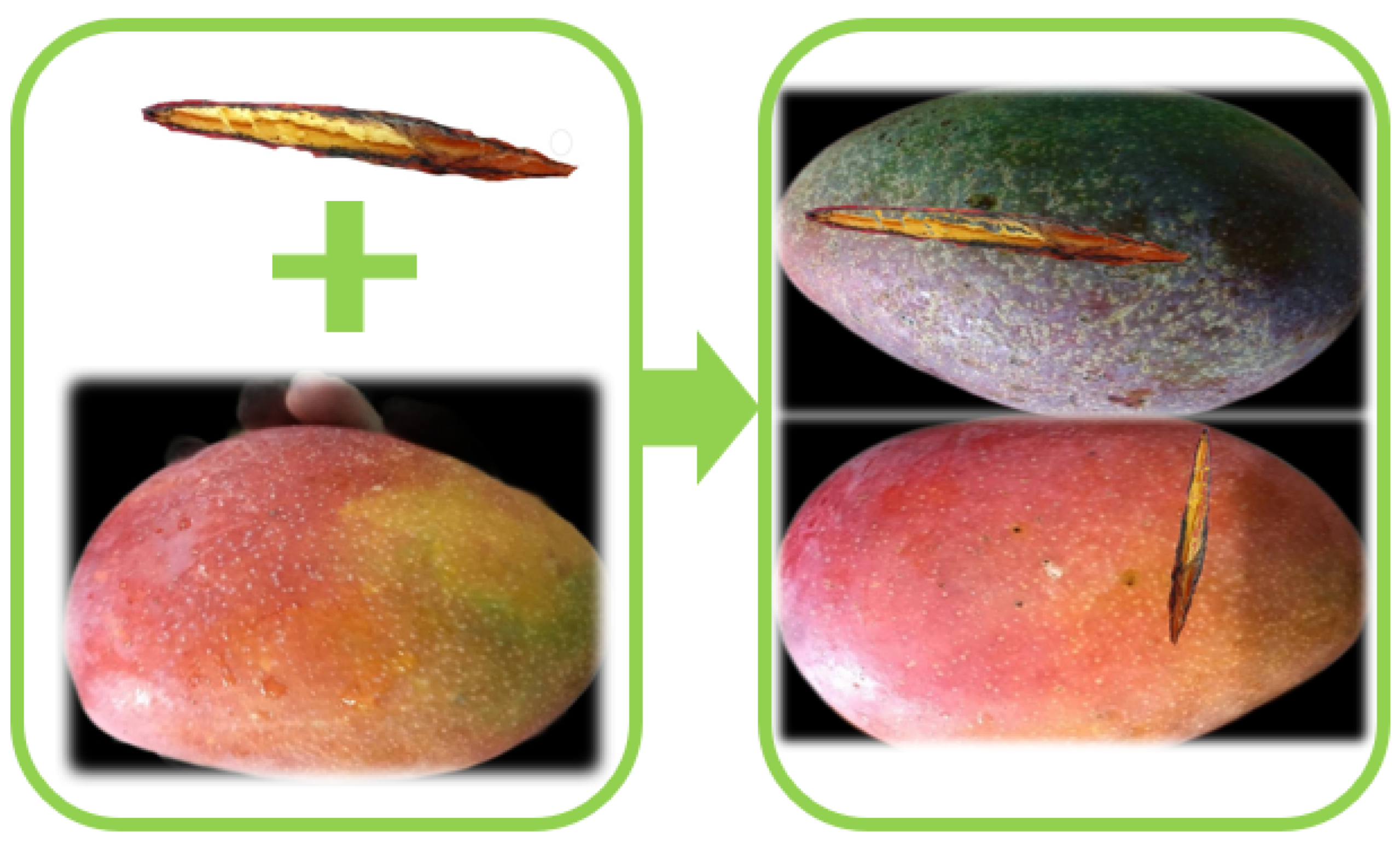 19] to artificially augment the number of samples in scarce defect categories. Specifically, we manually extract D2 defect regions from the original images to create masks, which are then randomly scaled, rotated, and blended onto clean mango surfaces. Synthesized images that exhibit visually implausible artifacts are manually filtered out, including cases where the pasted defect extends beyond the mango region, appears at an unrealistic scale (excessively large or small), or violates natural surface appearance. Through this process, the D2 category is expanded from 177 original samples to 672, significantly improving dataset diversity, as illustrated in