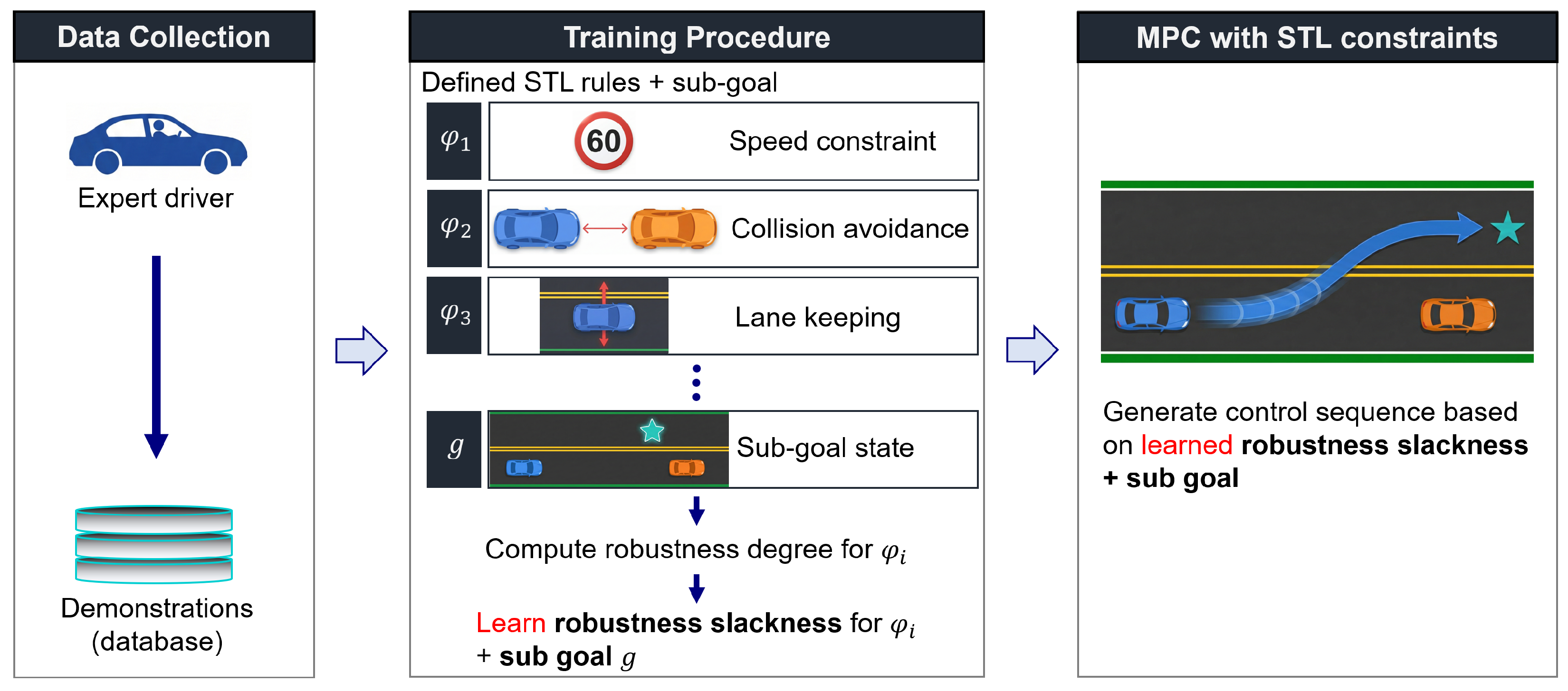 30]. Our prior work learned robustness slackness—rule-wise lower bounds on STL robustness inferred from demonstrations—and embedded them into MPC–STL via a conditional VAE mapping from context to slackness values [