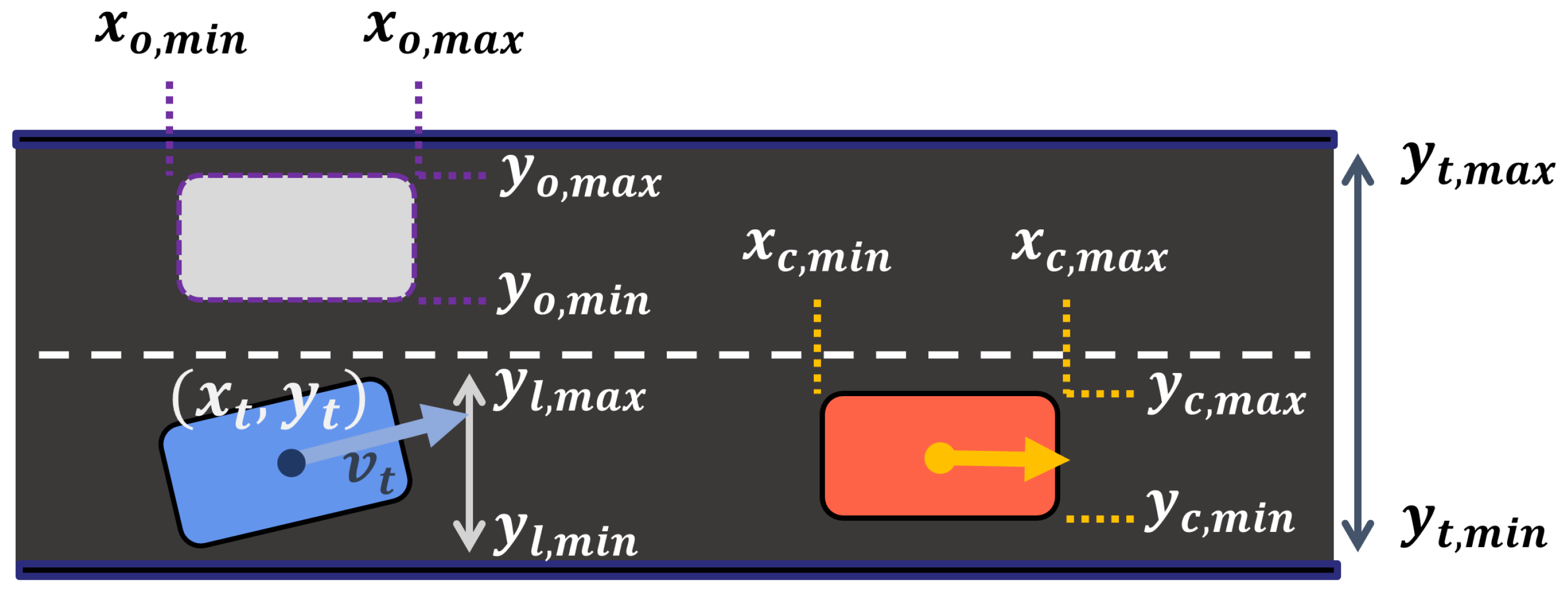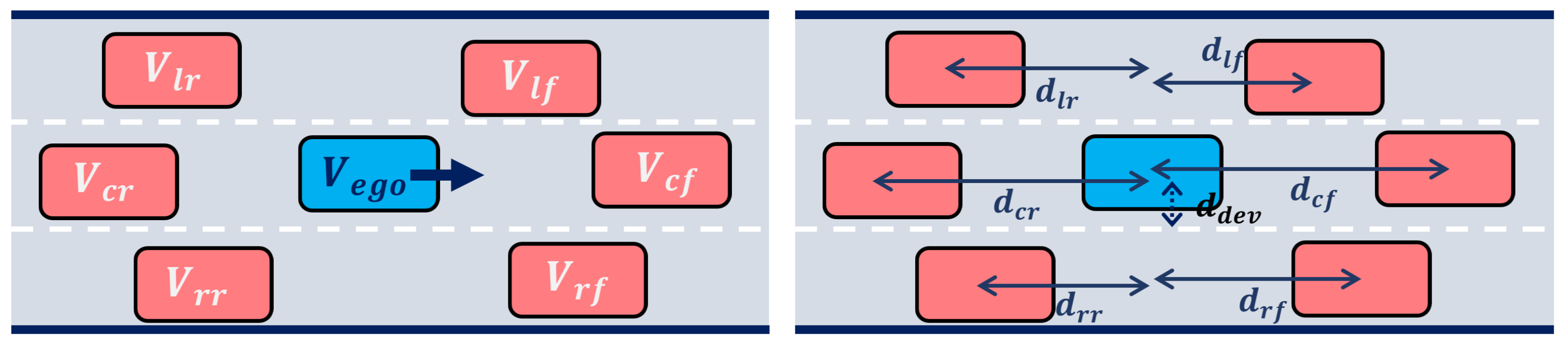 We consider five driving rules encoded as STL formulas . In our coordinate convention, larger y corresponds to the left side of the road, and smaller y corresponds to the right side.
