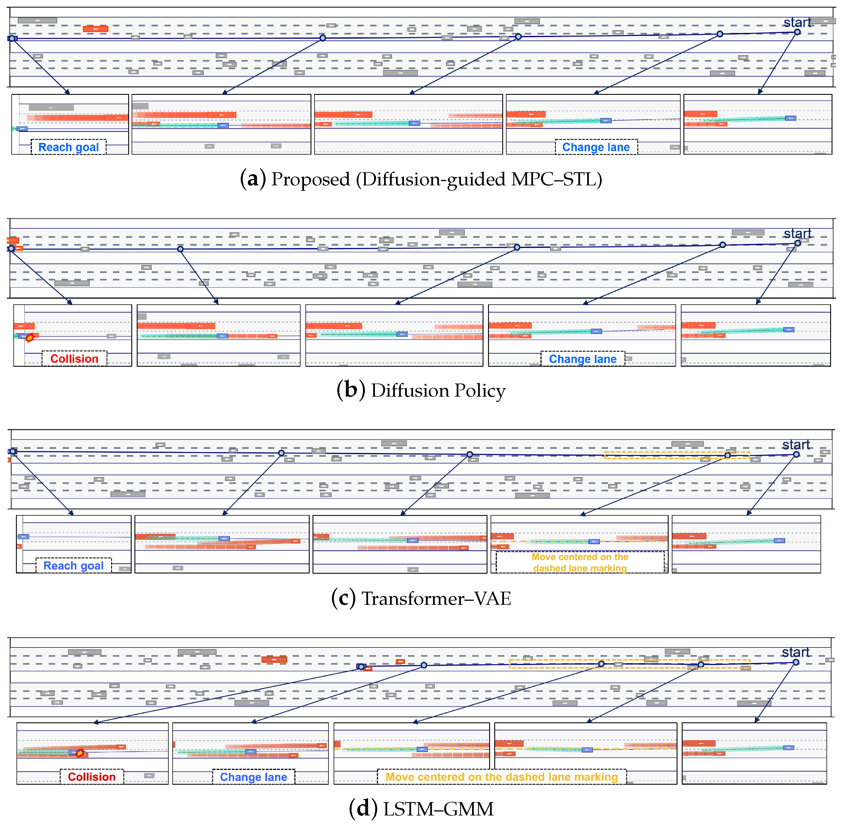 Figure 5 shows qualitative snapshots from a representative test scenario. The proposed method performs a smooth lane change and reaches the goal region while maintaining feasibility with respect to the MPC–STL constraints. In contrast, the diffusion-policy baseline progresses toward the goal but collides with a nearby vehicle near the terminal region. The Transformer–VAE reaches the goal; however, it exhibits an undesirable behavior of traveling along the dashed lane marking for an extended period. The LSTM–GMM baseline shows a similar tendency to linger on the dashed line and ultimately results in a collision. These snapshots highlight that, even with access to oracle nearby-vehicle futures, purely learned IL rollouts can exhibit long-horizon instability or unsafe maneuvers, whereas the proposed optimization-based controller yields more reliable, rule-aware behavior.