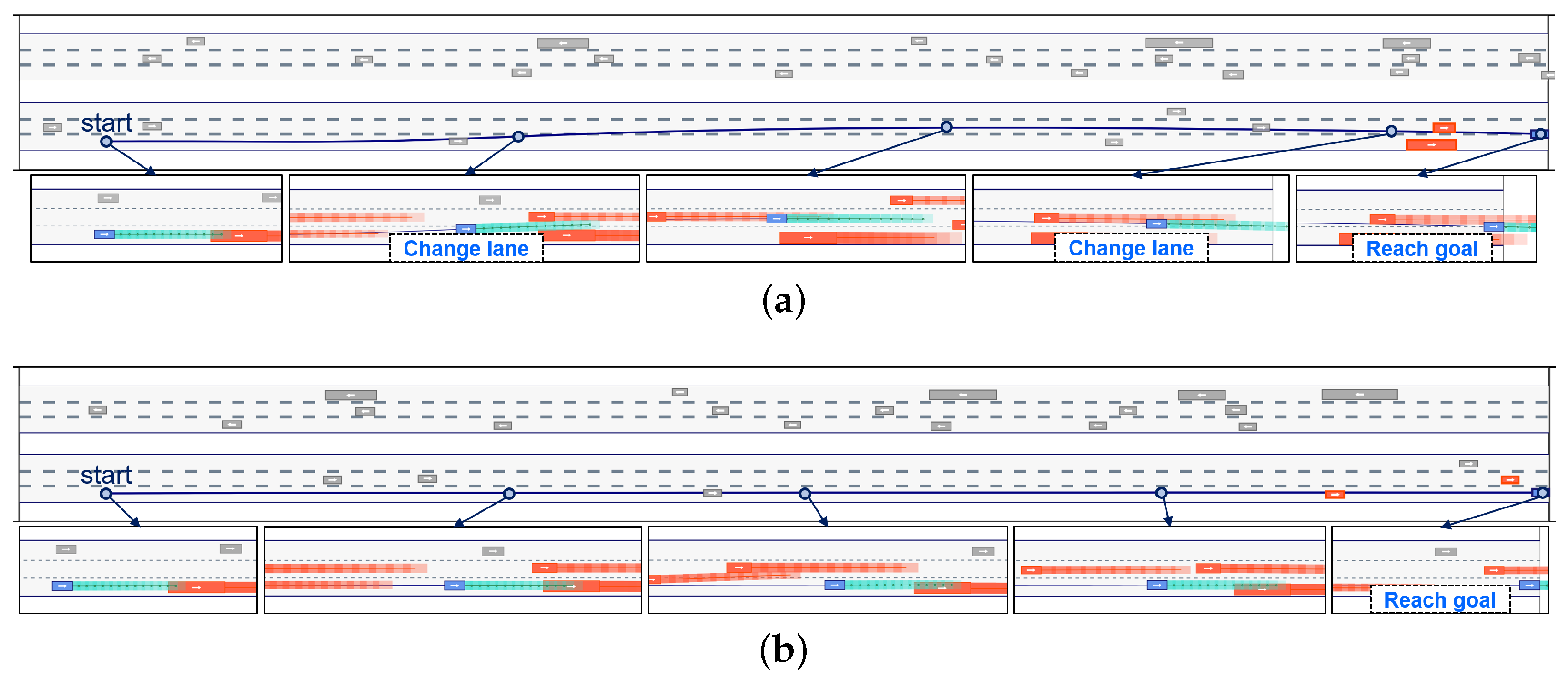 Figure 4 shows representative closed-loop rollouts on the highD dataset. For each scenario, the conditional diffusion model predicts (i) a sub-goal (goal point)