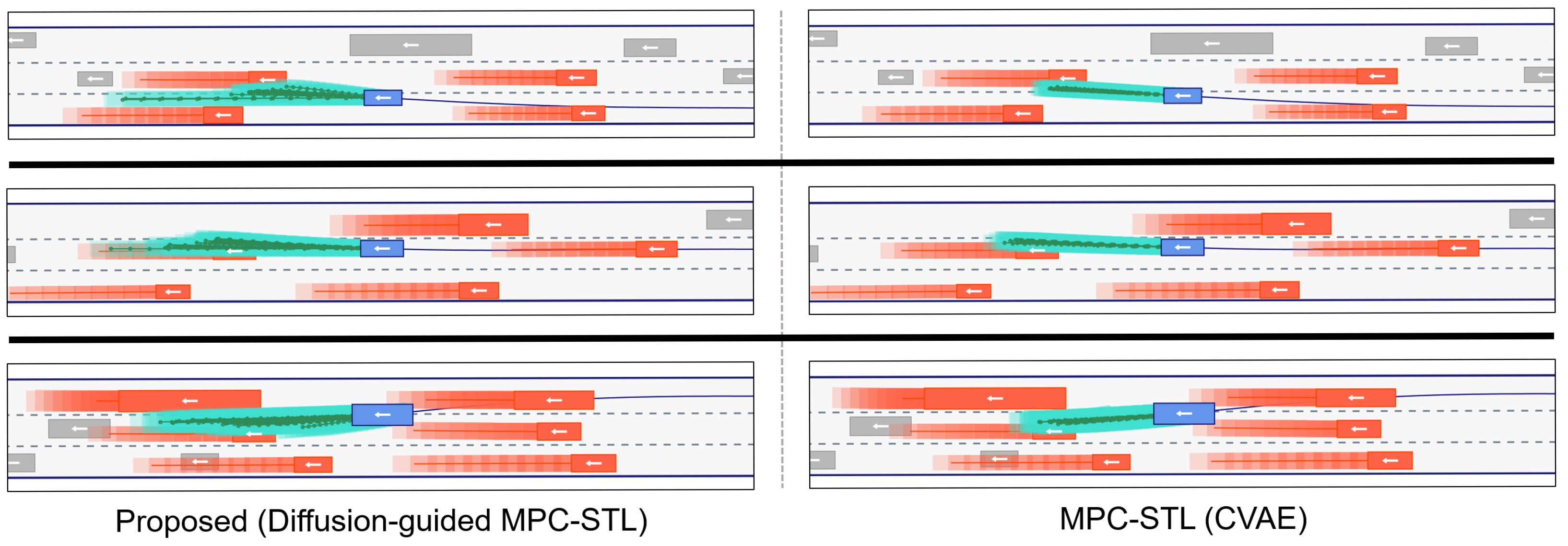 to reveal the diversity of candidate plans induced by each learned prior under the same context. The proposed diffusion-guided MPC–STL produces a noticeably more diverse set of feasible plans, capturing multiple plausible strategies (e.g., varying degrees of lateral motion and lane-change timing) under the same context. By contrast, the CVAE-based prior yields trajectories that are more concentrated around a single mode, resulting in limited behavioral diversity. This qualitative comparison supports our motivation for using diffusion in the MPC–STL setting: better mode coverage at the level of decision variables