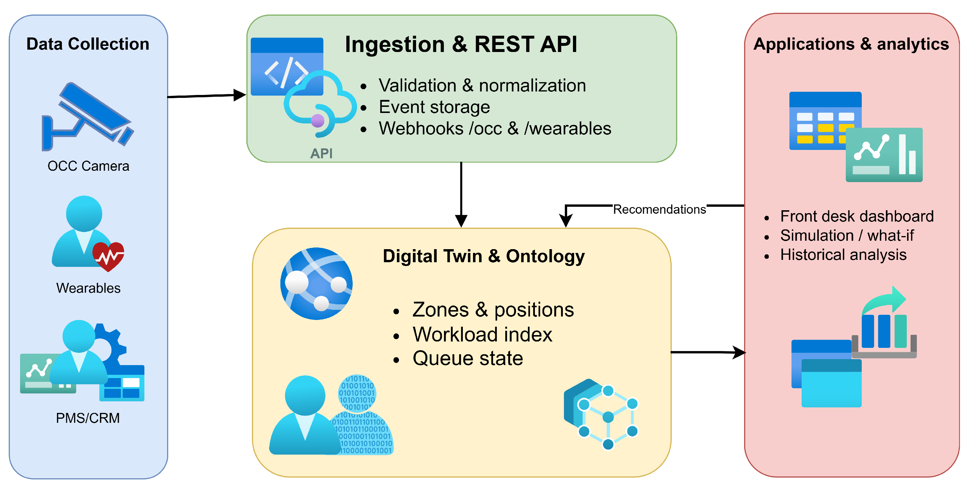The DT is designed to reason at the level that is necessary for front-desk decisions. Many KPIs are defined at zone or team level, such as queue length, occupancy per zone, dwell-time distributions, and the number of staff currently in a high workload state. Movement is typically summarized through zone transitions and dwell segments rather than continuous trajectories. For guests, the DT does not require mapping between detected_id and personal identity; guest-flow is represented through anonymous tokens and zone-level aggregates. For staff, individual-level workload indicators can be restricted to authorized roles and replaced by anonymized summaries when group-level analytics are sufficient.