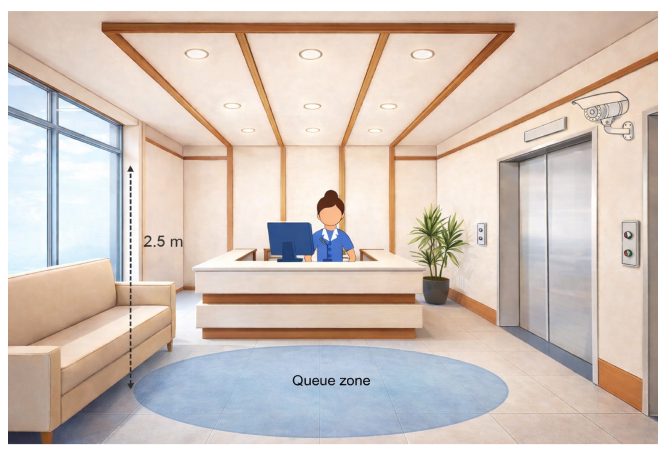 coordinates within predefined zones) that can be mapped onto an ontology-driven DT, enabling richer reasoning about queues, occupancy of service zones, and staff deployment at the reception.