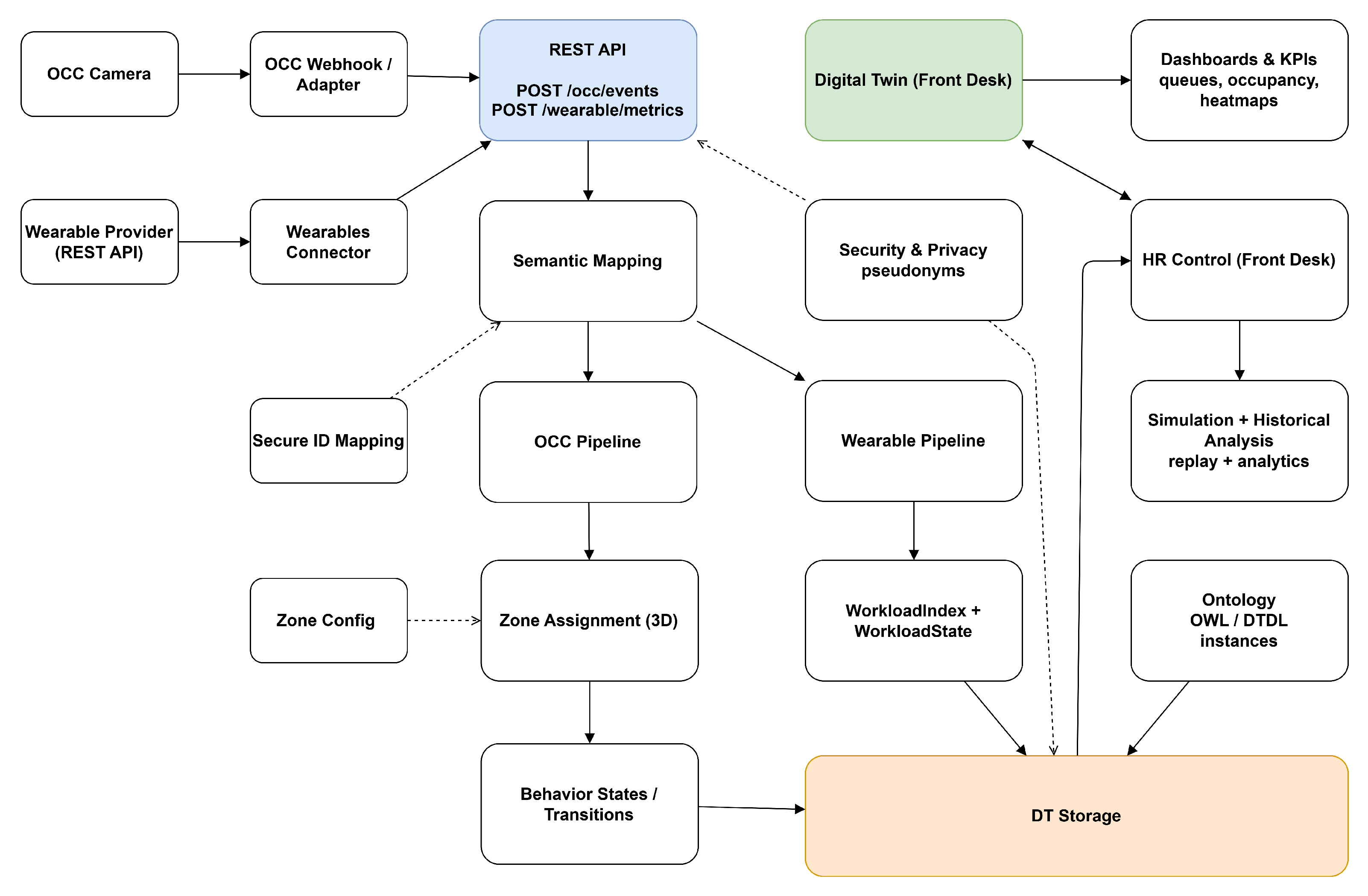 The DT specifies an OCC-based spatial processing pipeline that includes calibration, canonical-frame alignment, normalization of 3D coordinates, and zone assignment under confidence-aware handling. In parallel, a wearable workload pipeline aggregates windowed physiological and activity signals, applies per-person normalization, and maps features to a continuous workload index and categorical workload states. A modular implementation and a property-based REST API ingest events, map them to ontology instances, and expose DT state and KPIs through stable, technology-agnostic endpoints, enabling incremental evolution of the sensing infrastructure without breaking downstream integrations.