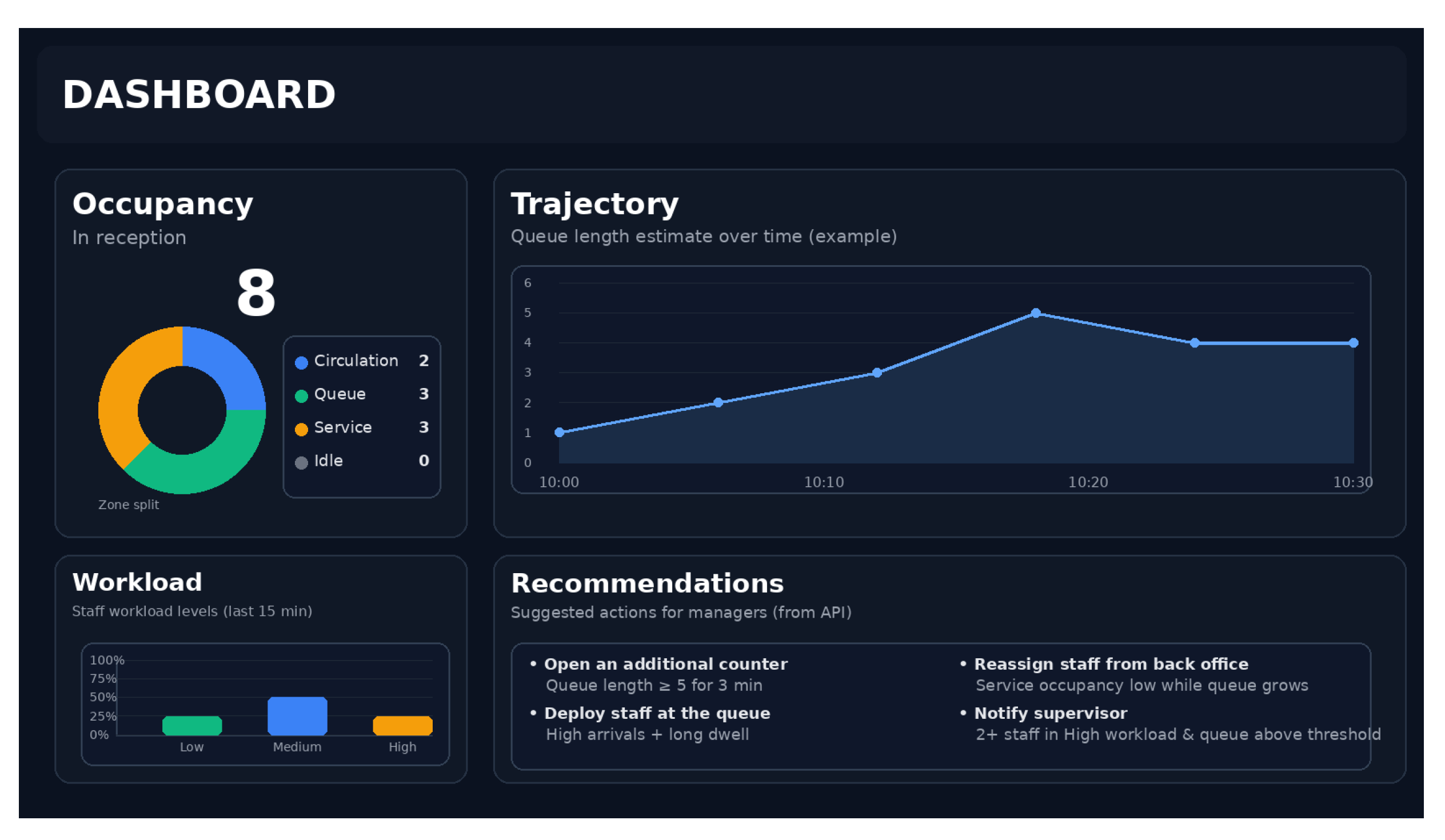 Beyond numerical KPIs, the DT generates human-interpretable recommendations intended for front-desk managers. Recommendations are produced by declarative rules and policies over ontology-level representations of occupancy, zone transitions, dwell segments, inferred queue state, and staff workload. Queue-management recommendations can be triggered when the queue load remains above a threshold for longer than a configured duration while at least one staff member is available and in a low-load state. Workload-balancing recommendations can be triggered when sustained High workload for one staff member co-occurs with predominantly Low/Medium workload for others, suggesting temporary rotation to reduce sustained overload.