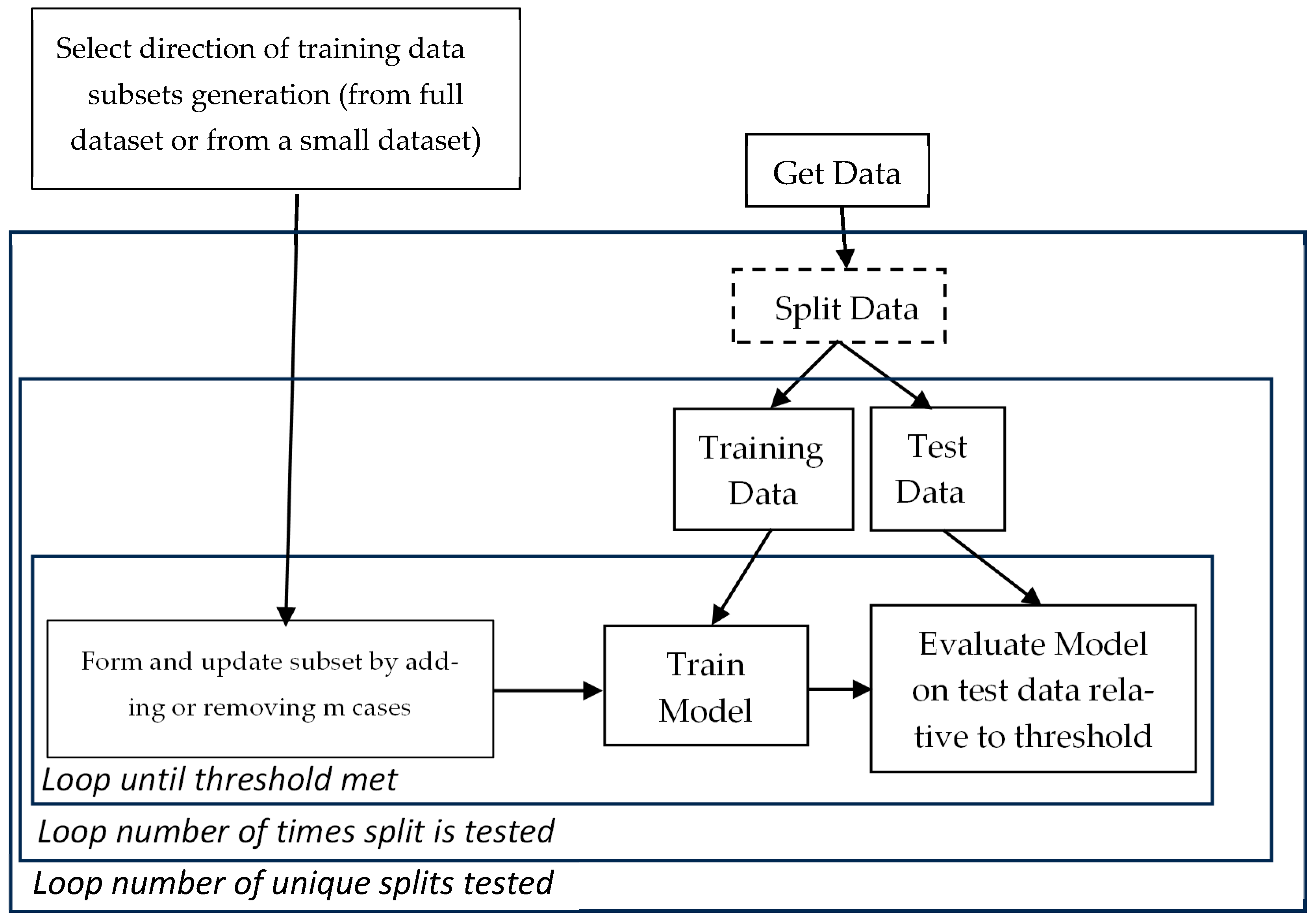 Exclusion Minimal Dataset Search (EMDS) Algorithm: Contrasting with the Inclusion Minimal Dataset Search, this algorithm starts on the entire training dataset S and removes data iteratively, retraining an ML algorithm to assess reaching threshold T.