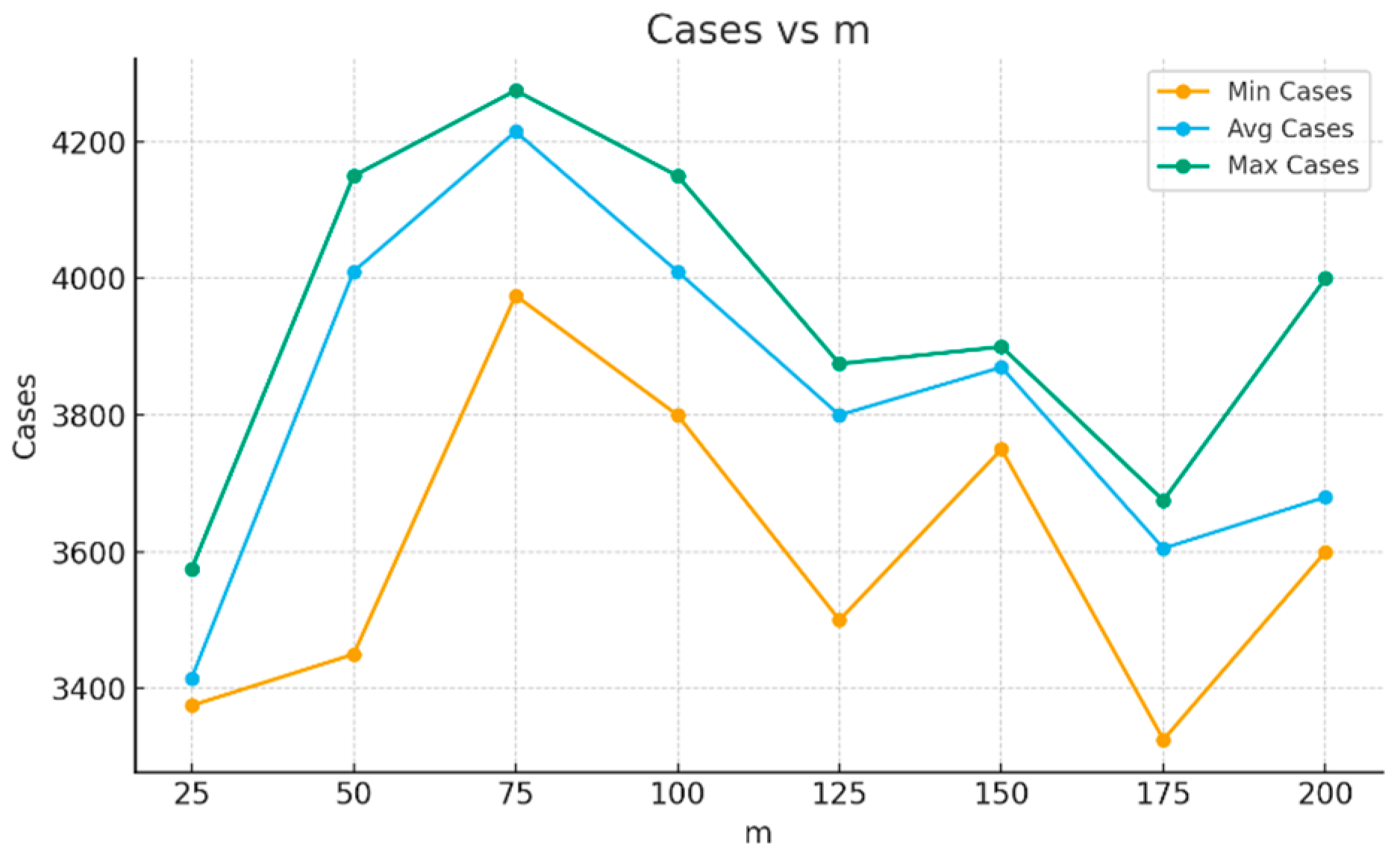 The number of cases on the average curve range from 3400 to 4200, or 5.7–7.0% of the full 60,000-case dataset. The maximum curve ranges from 3600 to 4300 cases, or 6.0–7.2% of the dataset. The minimum curve varies from 3400 to 3600 cases, corresponding to 5.7–6.0% of the data. Thus, although the curves in
