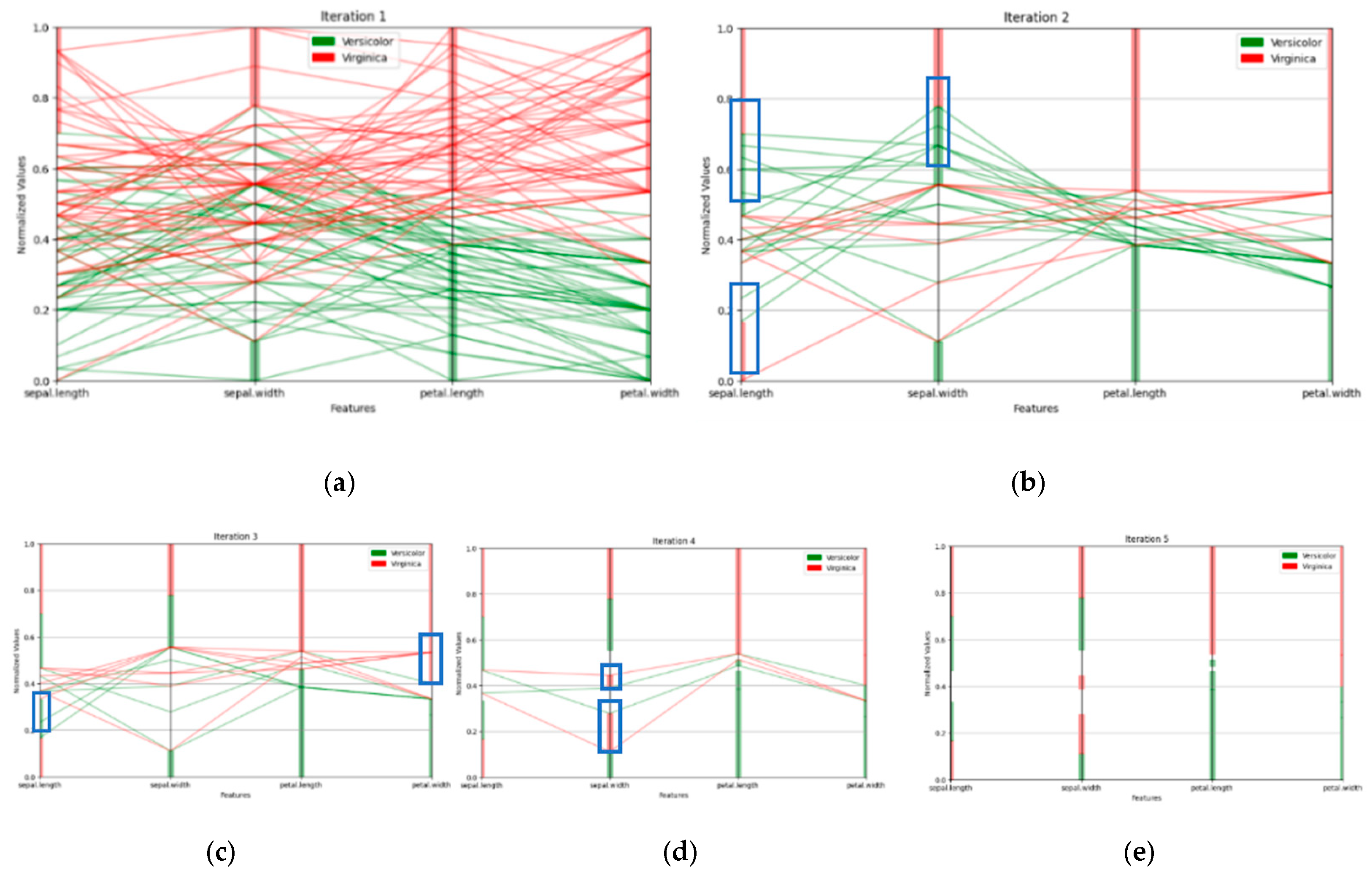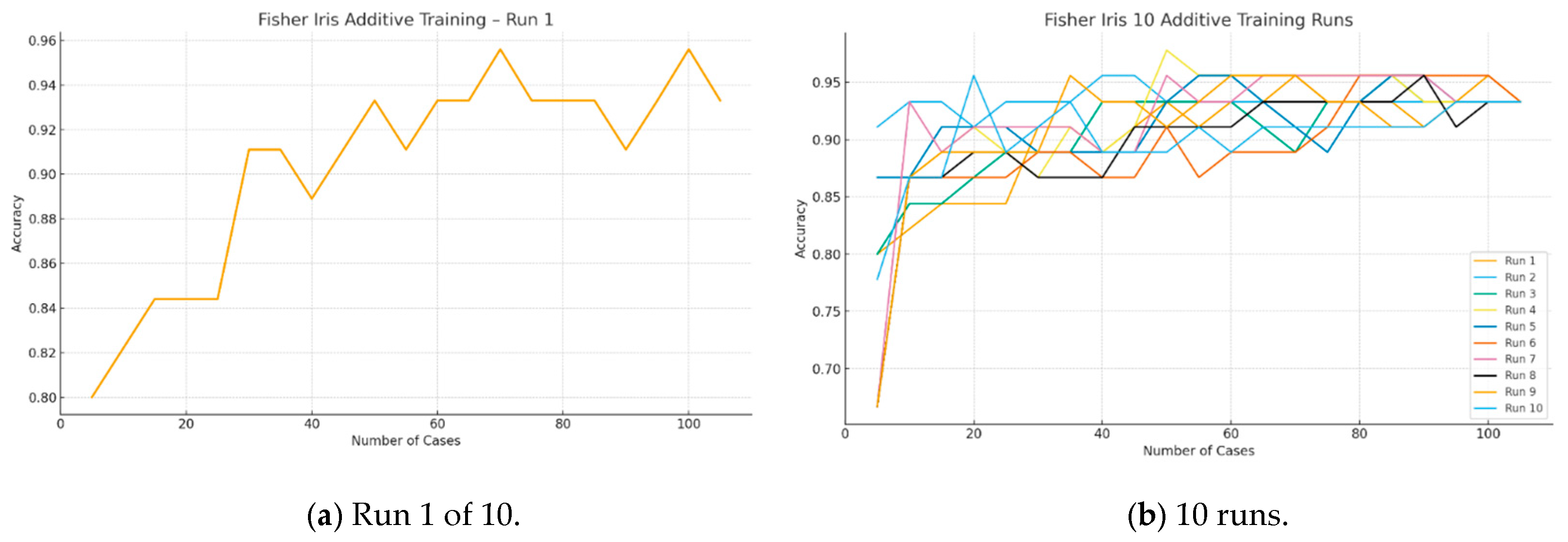 Figure 5 shows the results for the Fisher Iris dataset using a 70%:30% split of the 150 cases into training and test datasets. For a given split, we ran model training 100 times (