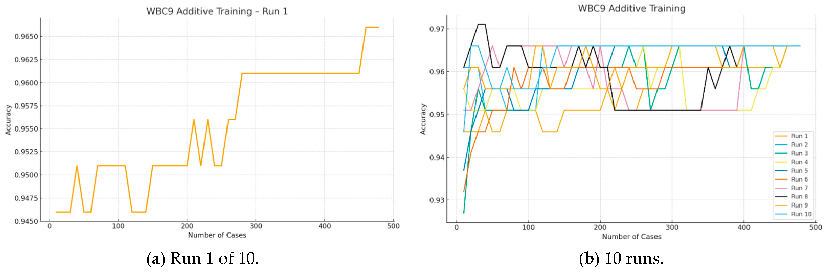 In the first experiment, we used the MNIST dataset, which is pre-split into 60,000 training cases and 10,000 test cases. In this experiment, 10 runs () were conducted for each value of (ranging from 25 to 200 cases) on the same data split, using BAP in a forward-direction for Model Sureness testing in which cases are added at each step. The ML algorithm used was a linear SVM. All tests in this study converged to a model accuracy of 95% or higher on the test data.
