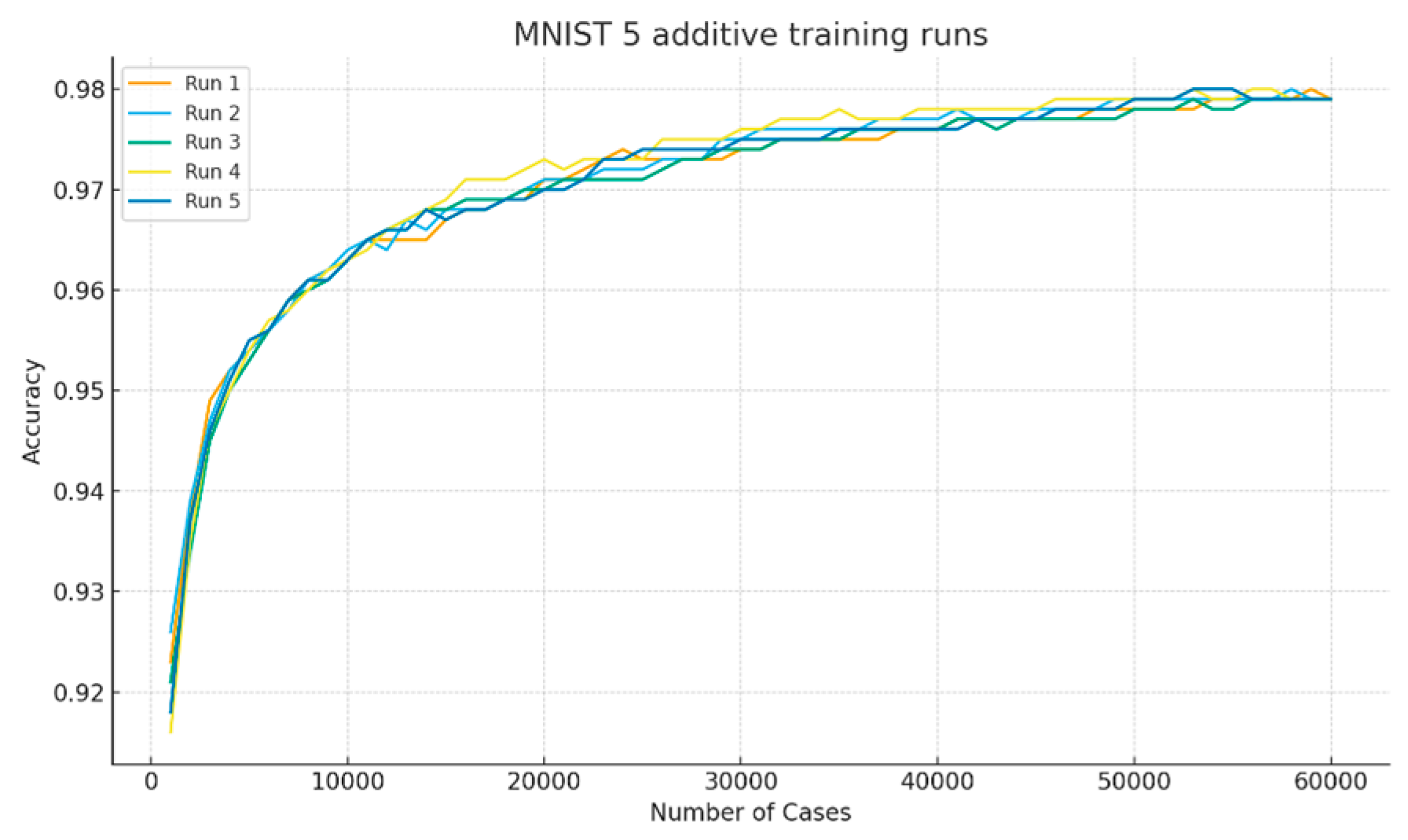 cases required about 10 min. These times correspond to 10 runs; thus, each individual run took approximately 7 min and 1 min, respectively. Note that, for 60,000 training cases, a step of 25 cases represents only 0.042% of the dataset, and even the larger step of 200 cases corresponds to only 0.33% of the dataset. Therefore, both step sizes are well below 1% of the dataset—this enables a more fine-grained Model Sureness evaluation process.