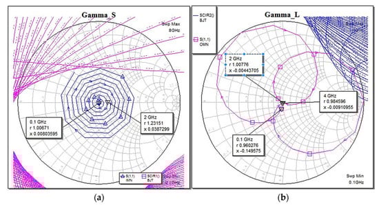 (a) Selected source reflection coefficient (ΓS) and (b) selected load reflection coefficient (ΓL).