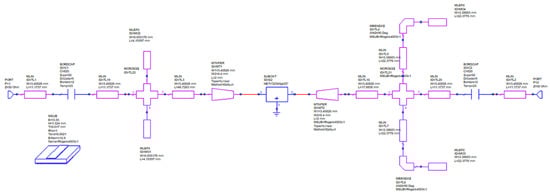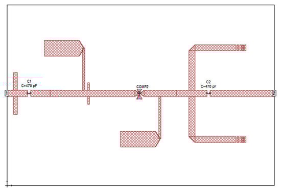 Following circuit-level optimization, the layout is exported as a DXF file and refined using full-wave EM simulation in Sonnet Software. DC blocking is implemented using 470-pF capacitors at the input and output ports. The bias network consists of cascaded low impedance and high-impedance quarter-wavelength transmission line sections, as illustrated in Figure 8.