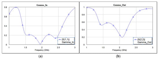 After optimization, the simulated reflection coefficients S11 and S22 remain well below the oscillation threshold across the operating band, confirming effective matching and stable operation, as shown in Figure 5a,b.
