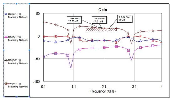 The circuit-level simulated gain response, shown in Figure 7, exceeds 17 dB from 1.7 to 2.3 GHz, consistent with the transistor’s datasheet maximum gain of approximately 18 dB under ideal conditions.