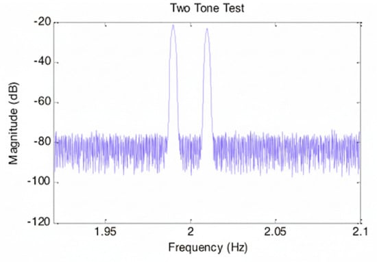 To further evaluate nonlinear behavior, a two-tone intermodulation test is carried out using two equal-amplitude input tones applied around 2 GHz. The frequency spacing between the tones is kept small (on the order of 1 MHz) so that third-order intermodulation products appear close to the fundamental tones without overlapping them. The resulting output spectrum is measured using a spectrum analyzer, as shown in Figure 14.