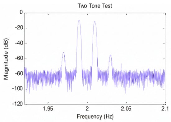 Output spectrum of the two-tone intermodulation test showing third-order intermodulation.