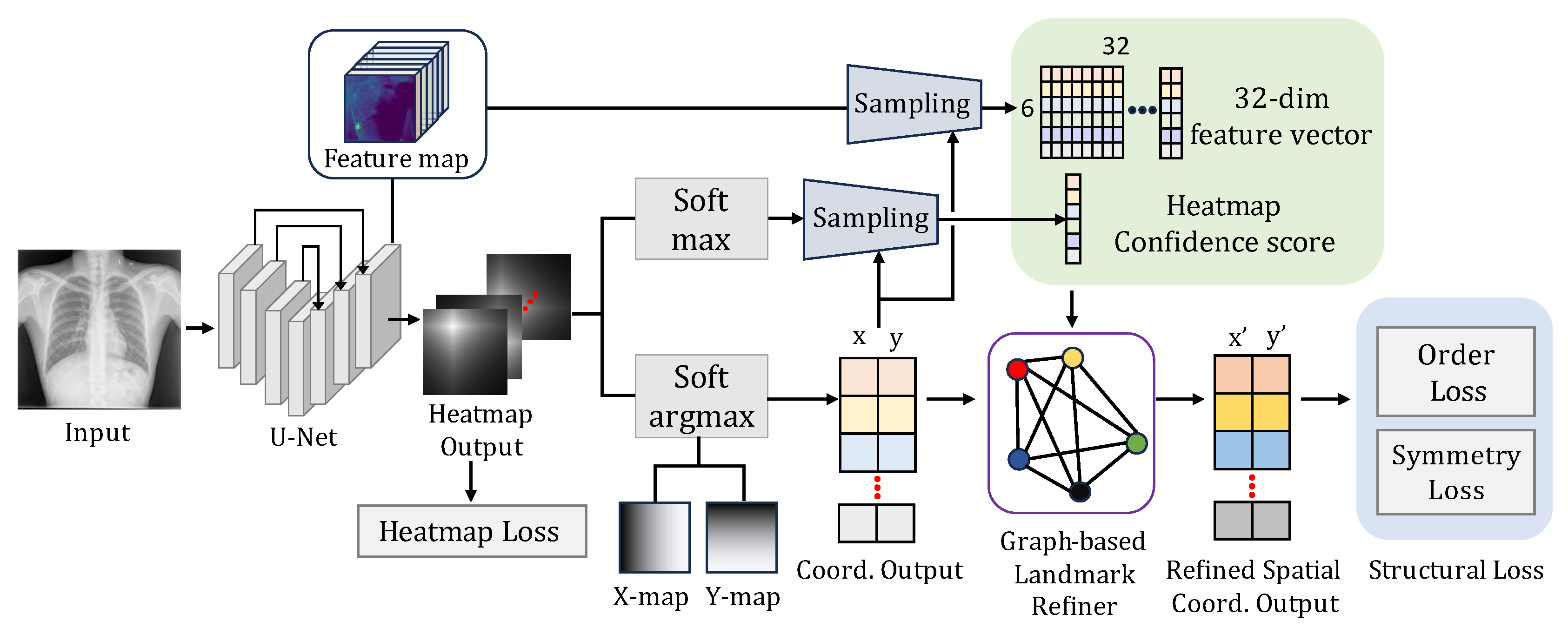 29]. These studies use graph neural networks (GNNs) to model structural dependencies among landmarks, or to refine heatmap-based predictions during a post-processing stage. However, because these methods rely on heatmap-derived coordinates, their performance can be influenced by the accuracy of the initial heatmaps, and inaccuracies may propagate through subsequent refinement steps.