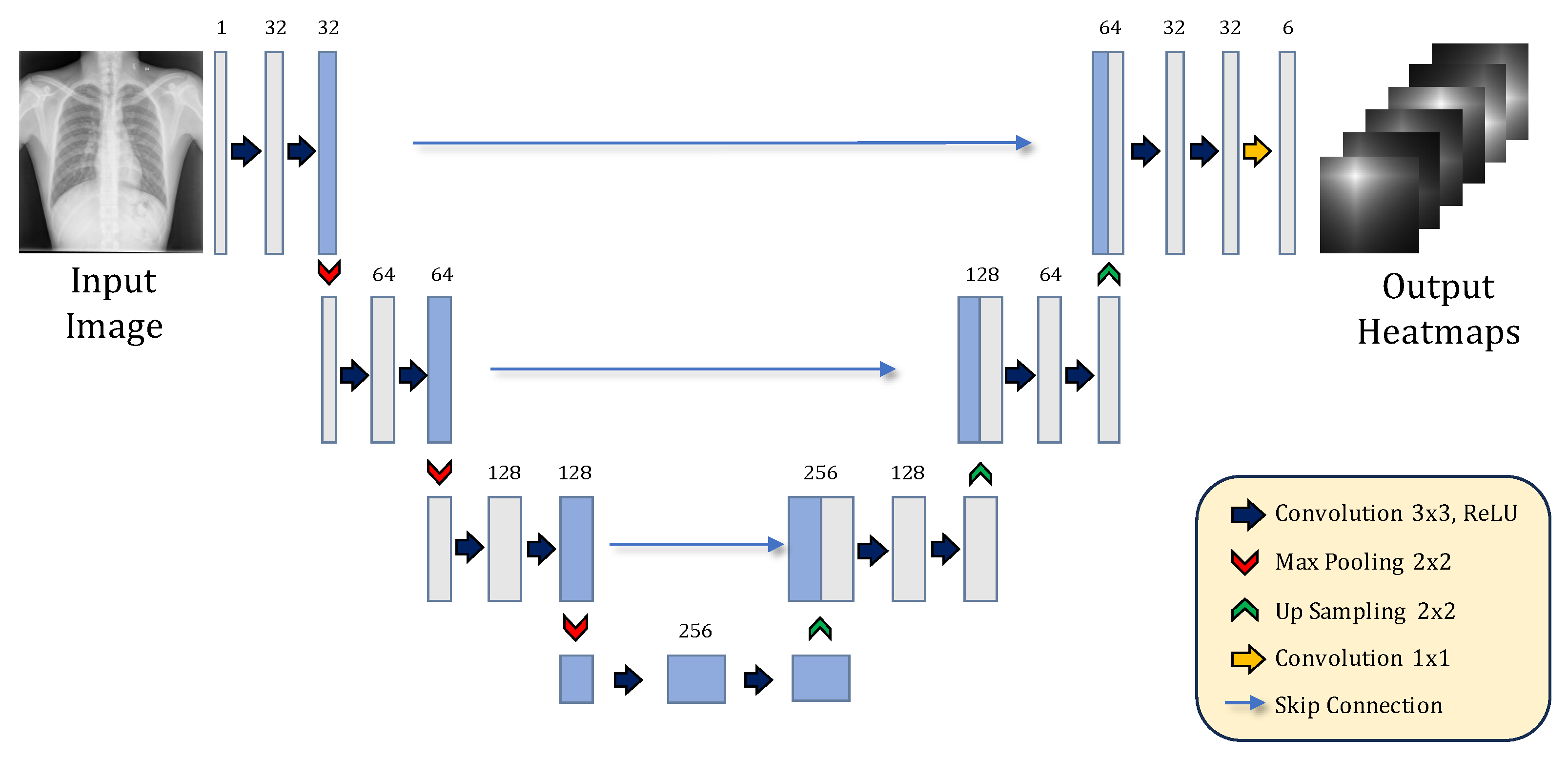 13], which serves as the heatmap regression backbone of the proposed framework. The U-Net is responsible for analyzing the input chest X-ray image and generating landmark-specific probability heatmaps. The model follows an encoder–decoder structure in which each block consists of two 3 × 3 convolutional layers, followed by instance normalization and ReLU activation. In the encoder, spatial resolution is progressively reduced through 2 × 2 max-pooling while the number of feature channels increases from 32 to 256. In the decoder, transposed convolution-based up sampling restores spatial resolution, and skip connections link feature maps of matching scales to preserve fine structural details.