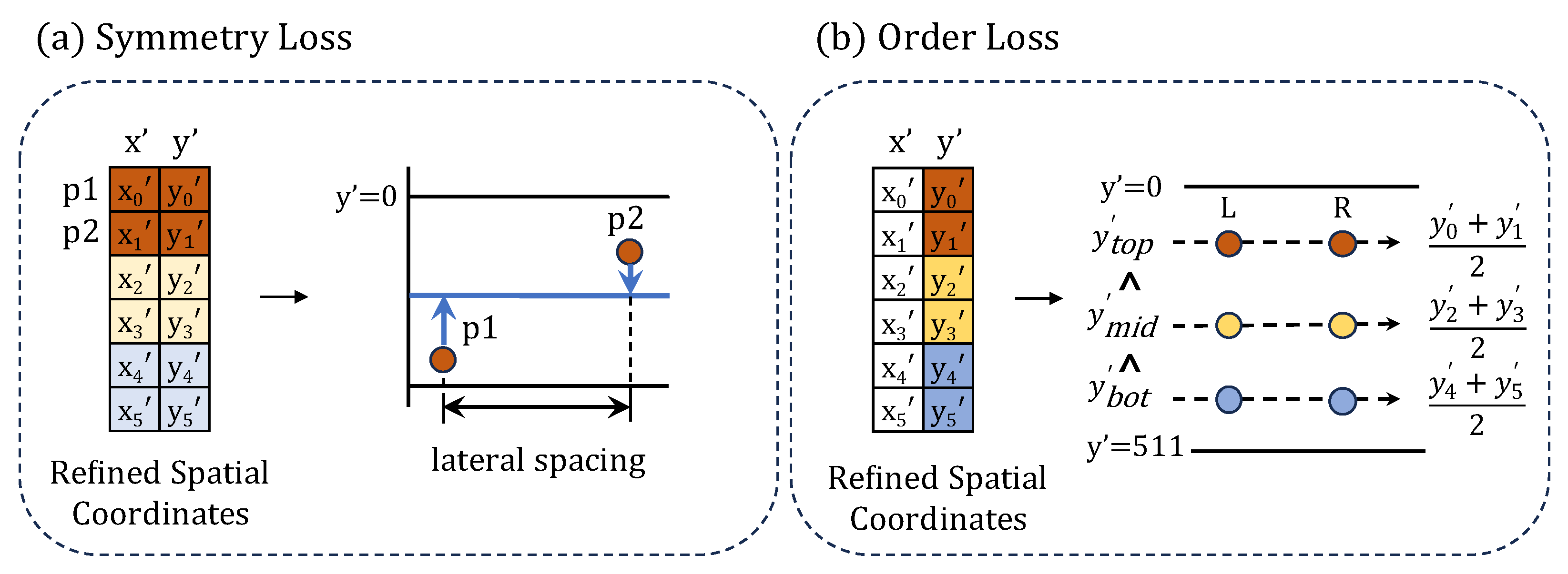 denote the averaged vertical positions of each left–right landmark pair. This loss defines the physical sequential relationships between landmarks that are required to follow a top–mid–bottom arrangement along the anatomical vertical axis. It prevents the reversal of landmark orders, thereby suppressing potential outlier predictions during the training process and ensuring global structural consistency.