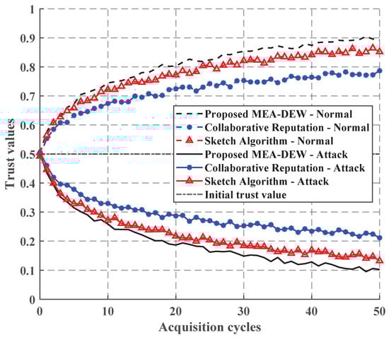 Figure 6 shows the trust comprehensive evaluation results of a terminal over time under intermittent attacks, in which the terminal performed well in the first 20 cycles, so the three algorithms all improved their trust values. From 20 cycles to 40 cycles, the terminal demonstrated attack behavior, and the three algorithms all identified its abnormal behavior and reduced their scores. After 40 cycles, the terminal returned to normal, and the three algorithms gradually improved their scores. It can also be seen from the curve trend in the figure that although the three algorithms have similar trends, the MEA-DEW algorithm proposed in this paper rises and falls faster than the other two methods, indicating that the MEA-DEW algorithm has higher sensitivity and more accurate evaluation results.