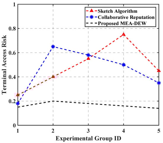 Through the statistics of relevant data, the quantitative test results of the evaluation accuracy of the terminal access security authentication trust evaluation algorithm based on zero trust are obtained, as shown in Table 1. Substitute the data in Table 1 into Equation (13), and the average values of the output scoring errors of the three evaluation algorithms are 0.08, 0.04, and 0.01, respectively. Compared with the two traditional methods, the MEA-DEW method in this paper reduces the values to 0.07 and 0.03, respectively, and the reduction amplitude reaches 87.5% and 75%. In addition, through the statistics of relevant data and the calculation of Equation (13), the test results of access risk are compared, as shown in Figure 8.