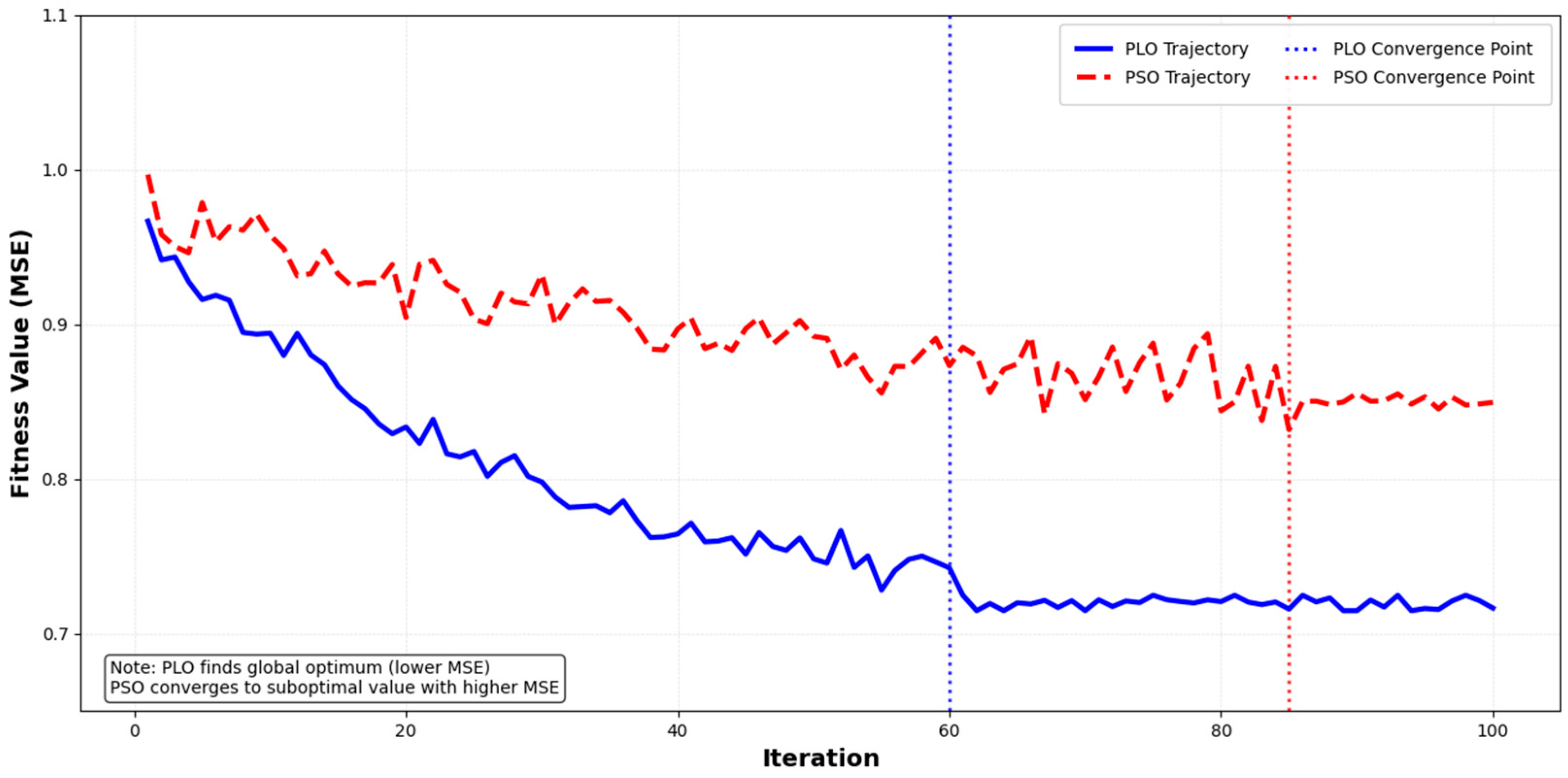 All deep learning models were implemented using PyTorch 2.1.0 and optimized with the AdamW optimizer. Training proceeded for a maximum of 200 epochs, with early stopping (patience is 20 epochs) monitored on the validation loss. A batch size of 32 was used throughout. The loss function was Mean Squared Error (MSE). To ensure statistical significance, all experiments were repeated three times with different random seeds, and the reported results are the mean. The PLO and PSO optimization processes were also run independently three times, and the best-performing hyperparameter set was selected for final evaluation.