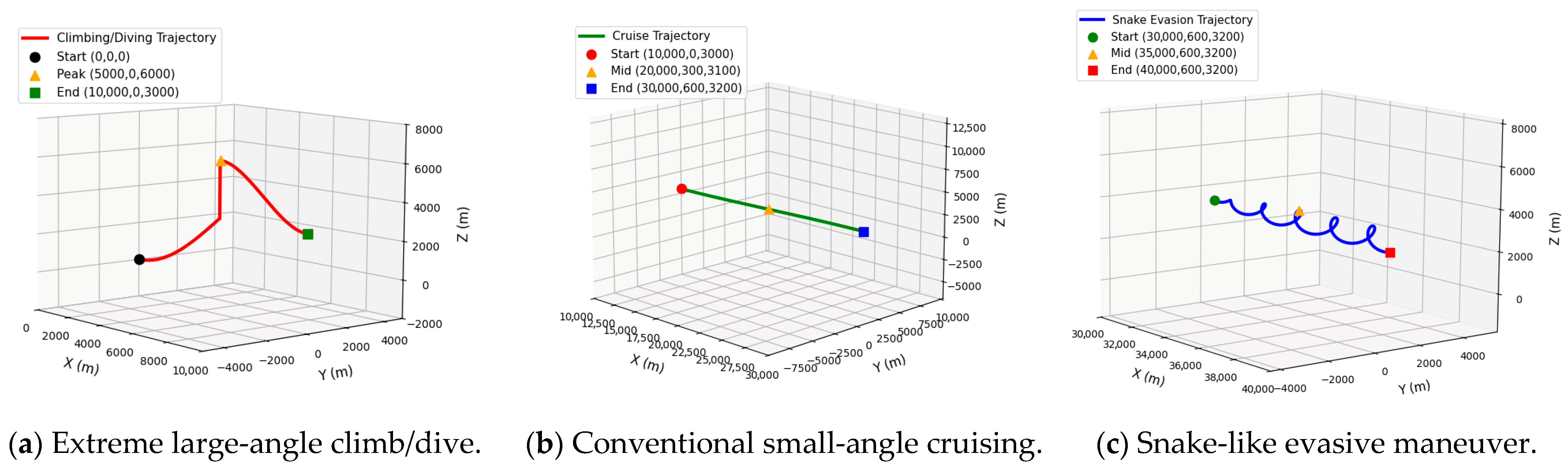 (1) Extreme large-angle climb/dive: Simulating the strong nonlinear maneuver process of the short-distance penetration of flight targets, large-angle attitude adjustment and high-overload vertical acceleration were set to focus on testing the model’s adaptability to dynamic mutation scenarios. The parameter design is as follows: The displacement in the X direction ranges from 0 to 10,000 m, there is no lateral offset in the Y direction (fixed at 0), and the Z direction completes a climb from 0 to 6000 m altitude, followed by a dive to 3000 m; the corresponding average climb angle is approximately 50°, the average dive angle is approximately 45°, and the vertical acceleration is controlled at ±5~6 G. This scenario focuses on verifying the model’s adaptability to dynamic mutation scenarios.